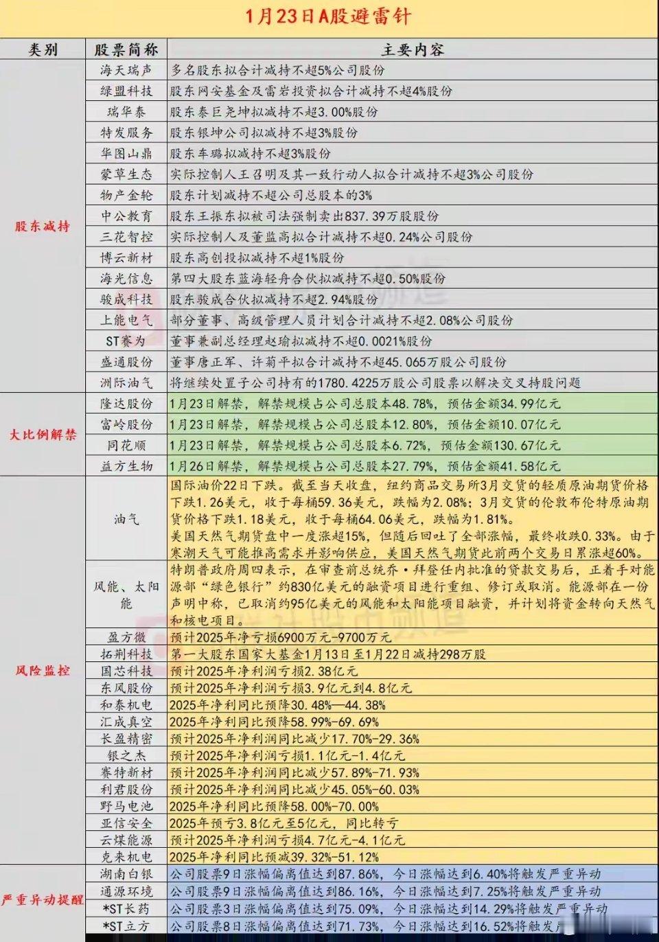 1月23日投资避雷针:三连板人气股预亏超6000万 多领域风险密集释放核心提要:财联社1月23日投资预警显示,A股及海外市场风险事件多点爆发。国内层面,居民短期消费贷余额跌破9.5万亿元关口,创三年以来新低,市场监管总局首次对公用事业领域经营者集中亮出红牌;公司端,三连板人气股盈方微2025年预亏6900万-9700万元,超20家公司扎堆披露减持、业绩预亏或下滑公告;海外市场,英特尔一季度业绩指引疲软引发盘后股价大跌,美国能源部取消95亿美元新能源项目资金转向传统能源,多重利空扰动市场情绪。一、 国内经济面风险信号1. 公用事业反垄断首现禁令 市场监管总局1月21日依法禁止佛山市南海区蓝鸟燃气与南官燃气等经营者新设合营企业案。该案系《反垄断法》实施以来,监管部门首次叫停公用事业领域经营者集中,剑指瓶装液化气市场垄断隐患,防范企业借集中推高价格加重民生负担。2. 居民短期消费贷创三年新低 据央行信贷收支数据,2025年末住户短期消费贷余额降至94900.77亿元,较上年末减少7061.91亿元,降幅达6.93%。这一数值不仅跌破9.5万亿元关口,更是2023年以来的最低水平,折射出居民消费杠杆持续压降、消费意愿偏弱的现状。二、 A股公司风险预警清单1. 业绩爆雷- 三连板人气股盈方微:预计2025年净亏损6900万元-9700万元,业绩颓势与短期股价异动形成鲜明反差。- 国芯科技、亚信安全等多家公司披露大额预亏公告,其中国芯科技预亏2.38亿元,亚信安全预亏3.8亿元-5亿元,同比由盈转亏。- 和泰机电、汇成真空等企业业绩同比降幅显著,汇成真空净利同比预降58.99%-69.69%,盈利承压明显。2. 股东减持潮- 海天瑞声:多名股东拟合计减持不超5%公司股份,减持比例居前。- 绿盟科技、特发服务、华图山鼎等公司股东拟减持比例均不低于3%,拓荆科技获国家大基金减持298万股,产业资本减持动作密集。3. 其他风险- 中公教育:股东王振东拟被司法强制卖出837.39万股股份。- 洲际油气:拟处置子公司持有的1780.42万股股票,以解决交叉持股问题。三、 海外市场风险扰动1. 科技巨头业绩爆雷 英特尔发布疲软一季度业绩指引,预计调整后每股收益为0美元,远低于市场预估的0.08美元;营收指引区间117亿-127亿美元,同样不及市场预期,引发公司盘后股价一度大跌超13%,拖累全球科技板块情绪。2. 能源政策转向冲击新能源赛道 美国能源部宣布取消约95亿美元风能和太阳能项目融资,计划将资金转向天然气和核电项目,政策转向对全球新能源产业链构成利空。3. 大宗商品与地缘风险 国际油价22日显著下挫,美油、布油跌幅均超1.8%;美国天然气期货价格宽幅震荡,盘中涨超15%后回吐全部涨幅收跌。此外,美国总统特朗普表态称若欧洲抛售美债将实施大规模报复,地缘与金融市场联动风险值得警惕。