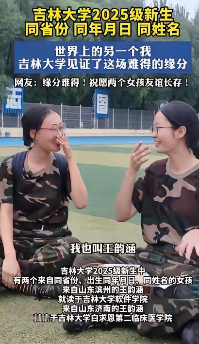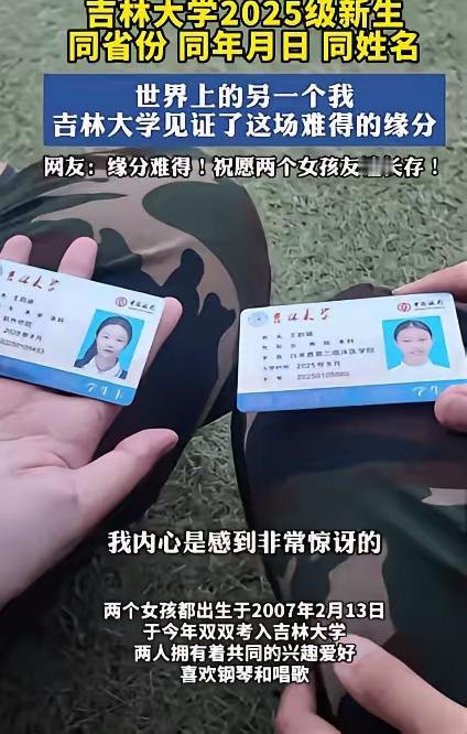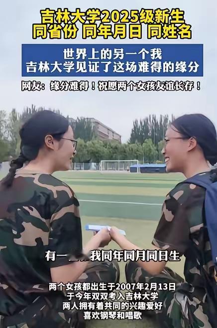 这则新闻故事真是令人感叹命运的奇妙安排!两个在吉林某高校新生军训中意外“撞脸”的“同名同姓同生日”的女孩,不仅名字一样、出生日期相同,甚至连家乡都在山东,长得也几乎一模一样,真是“世纪奇遇”。这样的巧合概率极低,可能远远超出普通人想象的范围——难怪网友们都觉得这是“命中注定”的巧合,甚至调侃“赶紧查查是不是抱错了孩子”。 这故事引发了网友们的丰富联想和讨论,从调侃“认亲”到幻想“平行宇宙”,再到建议让她们分到一个宿舍,种种评论都体现出人们对未知和命运安排的浓厚兴趣。两位女孩面对这份奇遇的淡然与平静,更显得珍贵,她们用“以后就是亲姐妹了”这样轻松的态度,传递出对人生的豁达与乐观。 这件事告诉我们,生活中充满了意想不到的惊喜和巧合,也许平凡的日子里,正藏着一些令人难以置信的奇迹。这样的故事不仅让人会心一笑,也让我们相信,世界之大,无奇不有,只要保持好奇心,就有可能迎来属于你的“意外惊喜”。 如果你也喜欢这样的故事,不妨多留意生活中的小巧合,也许下一次的惊喜,就在你不经意的瞬间悄然发生。撞脸 容貌相似 巧合