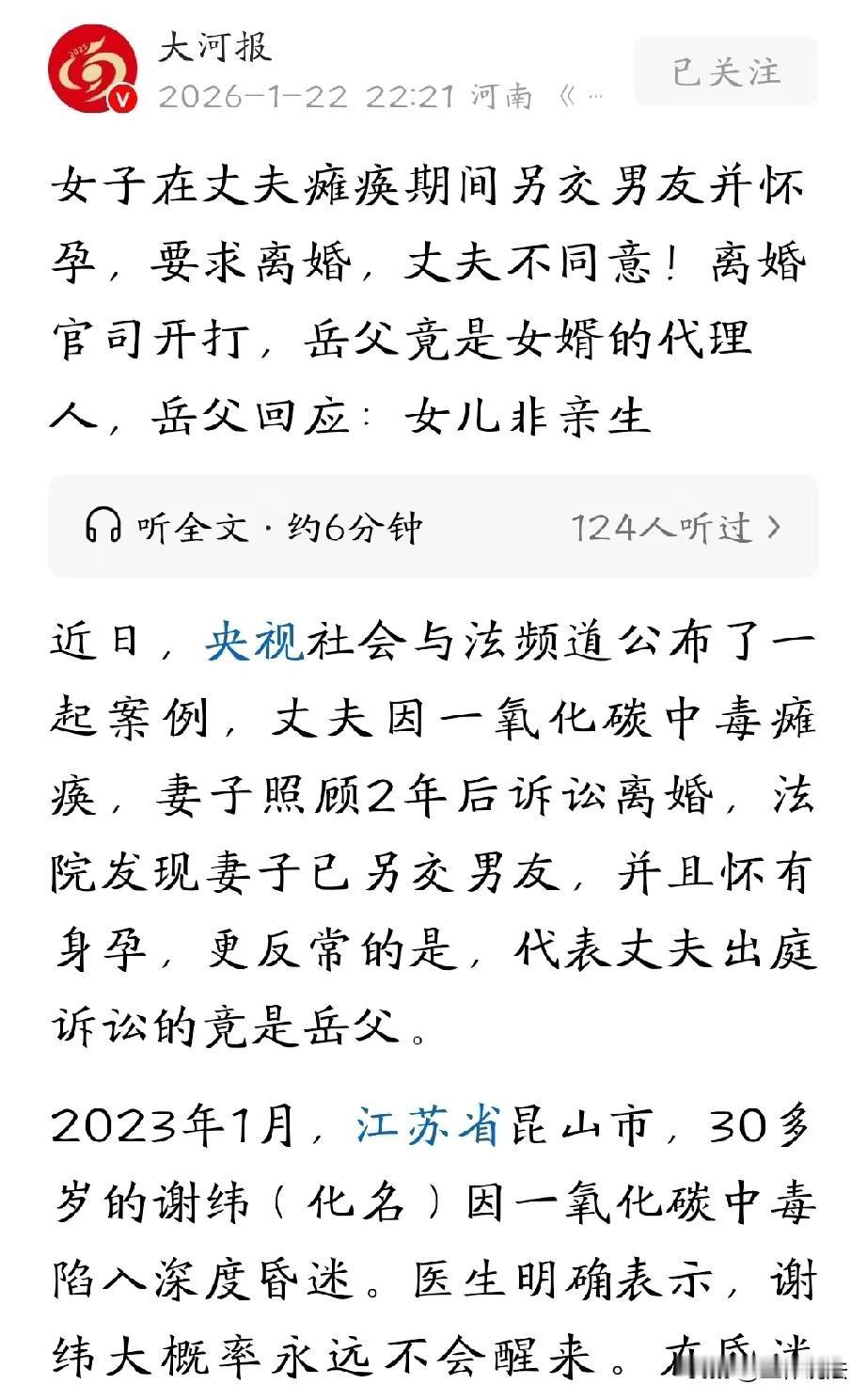 江苏昆山,夫妻二人外出打工期间,男子因一氧化碳中毒瘫痪,生活完全不能自理。妻子没有抛弃他,一直照顾了2年多,但后来还是熬不下去,转身投入了其他男人的怀抱。妻子怀了别人的孩子,起诉离婚,男子死活不愿意,双方闹上法庭,代表男子出庭的,竟然是自己的岳父。而岳父接下来的一句话,更是让人大吃一惊。 男子谢某出生于1987年,2015年,经人介绍,他认识了比自己小一岁的段某,没过多久,两人就携手步入了婚姻殿堂。 婚后,两人感情那叫一个好。谢某不善言辞,但性格温和,特别有赚钱的能力,每次赚了钱,还没在兜里捂热乎呢,就赶紧交给妻子段某。 而且,不管刮风下雨,他都会雷打不动地接送段某上下班,把爱意都实实在在地体现在行动里。 段某的父母对谢某这个女婿也是十分满意,把他当成亲儿子一样对待。 2020年,他们的儿子小宝出生了,这小家庭更是充满了欢声笑语。 为了能给家人提供更好的生活条件,2021年,夫妻二人把小宝托付给父母照顾,然后一起前往江苏省务工。 然而,平静的生活在2022年12月18日这天被打破了。 事发当天,谢某突然感觉身体不舒服,一直觉得冷。他想着可能是感冒了,就打开空调,吃了感冒药,然后躺下睡觉了。 为了避免传染给妻子,当晚他还和段某分房睡。 可吃了药后,谢某还是觉得冷得不行,他也没多想,就加大了服药剂量,还找了个铝盆,在房间里烧炭取暖。 第二天清晨,天还没亮,段某就早早起床,丈夫做了早饭,可等她做好早饭,去叫谢某的时候,却发现怎么也叫不醒他了。 段某一下子慌了神,赶紧把谢某送去了医院。 经过紧急抢救和后续的康复治疗,谢某虽然苏醒了过来,但却瘫痪在床,生活完全无法自理。 段某的天塌了一半,虽然谢某有母亲,但其母亲张某身高只有1.2米,还患有精神类疾病,生活几乎没办法自理,连自己儿子是谁都认不出来。 谢某出生后一直由父亲抚养,可他3岁的时候,父亲就离世了,此后,他就只能吃着百家饭长大。 13岁的时候,他辍学务农,18岁又背井离乡出去打工,直到认识了段某,还得到了老丈人老谢的认可,这才算是有了个安稳的家。 所以,照顾谢某的重任全落在了段某一人身上,这一照顾就是两年多。 因为一氧化碳中毒,谢某不仅瘫痪生活无法自理,神经也受到了损伤。 两年多的时间里,段某里里外外支撑着一个家,在无人帮衬的情况下,她最终还是坚持不下去,投向了其他男人温暖的怀抱。 2025年5月,段某果断向谢某提出了离婚。 段某主张离婚的理由是,谢某既不履行夫妻义务,又缺乏家庭责任意识,她觉得夫妻感情已经完全破裂了。 可谢某死活不同意,但让众人没有想到的是,此时段某已经怀有身孕了。 这下,不同意也没有办法了,谢某作为男人的自尊心被深深刺痛,他一怒之下闹上法庭。 经过鉴定,谢某属于无民事行为能力人,需要由代理人来参与离婚诉讼等相关事宜。 按照法律惯例,无民事行为能力人应该由配偶、父母等至亲代理诉讼。 可这案子是离婚官司,配偶自然不能代理,谢某母亲没办法参与,他也没有其他亲属。 在这种情况下,岳父老谢看不下去,竟然申请成为了谢某的监护人。 老谢有着双重身份,一边是女儿段某的父亲,一边又是女婿谢某的监护人。 在这双重身份的压力下,他到底会更注重哪一方的利益呢? 老谢表示,他其实是支持女儿离婚的,看着女儿这两年熬的如此艰难,他也十分心疼。 法官特别慎重,仔细考察有没有父亲和女儿串通,离婚后再抛弃谢某的情况出现。 法庭上,老谢又说出了一个让案情更加扑朔迷离的情况,原来段某并不是他的亲生女儿,而是继女。 这一下,整个案件变得更加复杂了,大家都在等待,看法院最后会怎么判决。 夫妻本是同林鸟,大难临头各自飞,说起来难听,但真到了那种绝境,不是每个人都能做到“患难与共”的。 可段某也是个普通女人,不是铁打的。长期的压力、看不到头的困境,再加上身边没人帮衬,心里的那根弦断了也正常。 她想要重新找个依靠,过正常的生活,这种想法虽然让人心寒,但也不是完全不能理解。