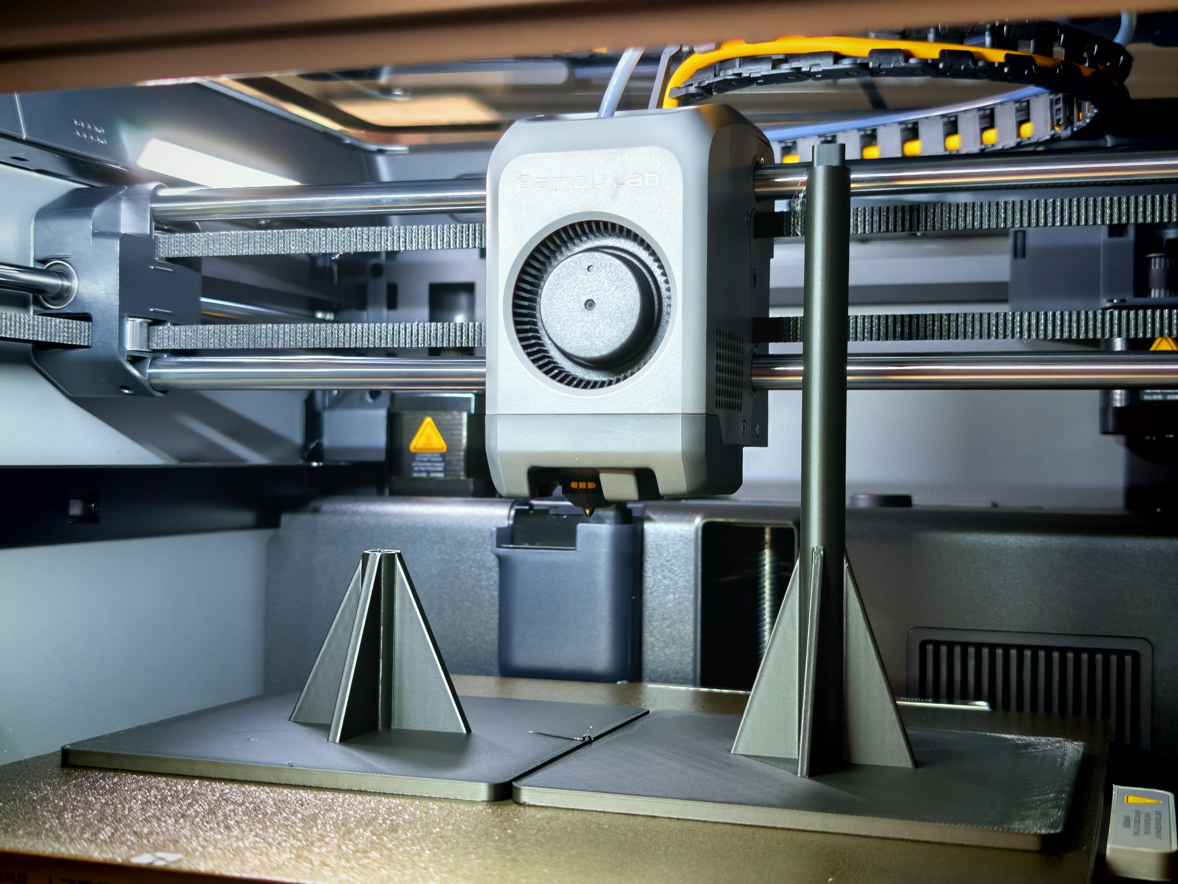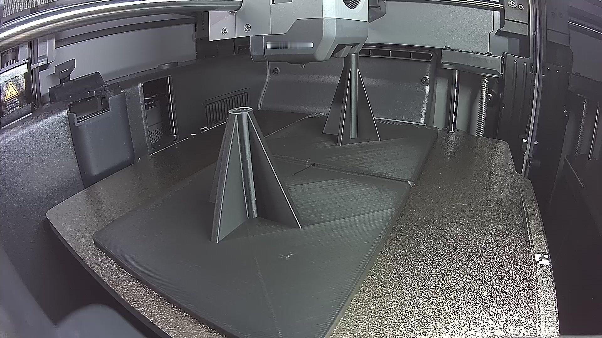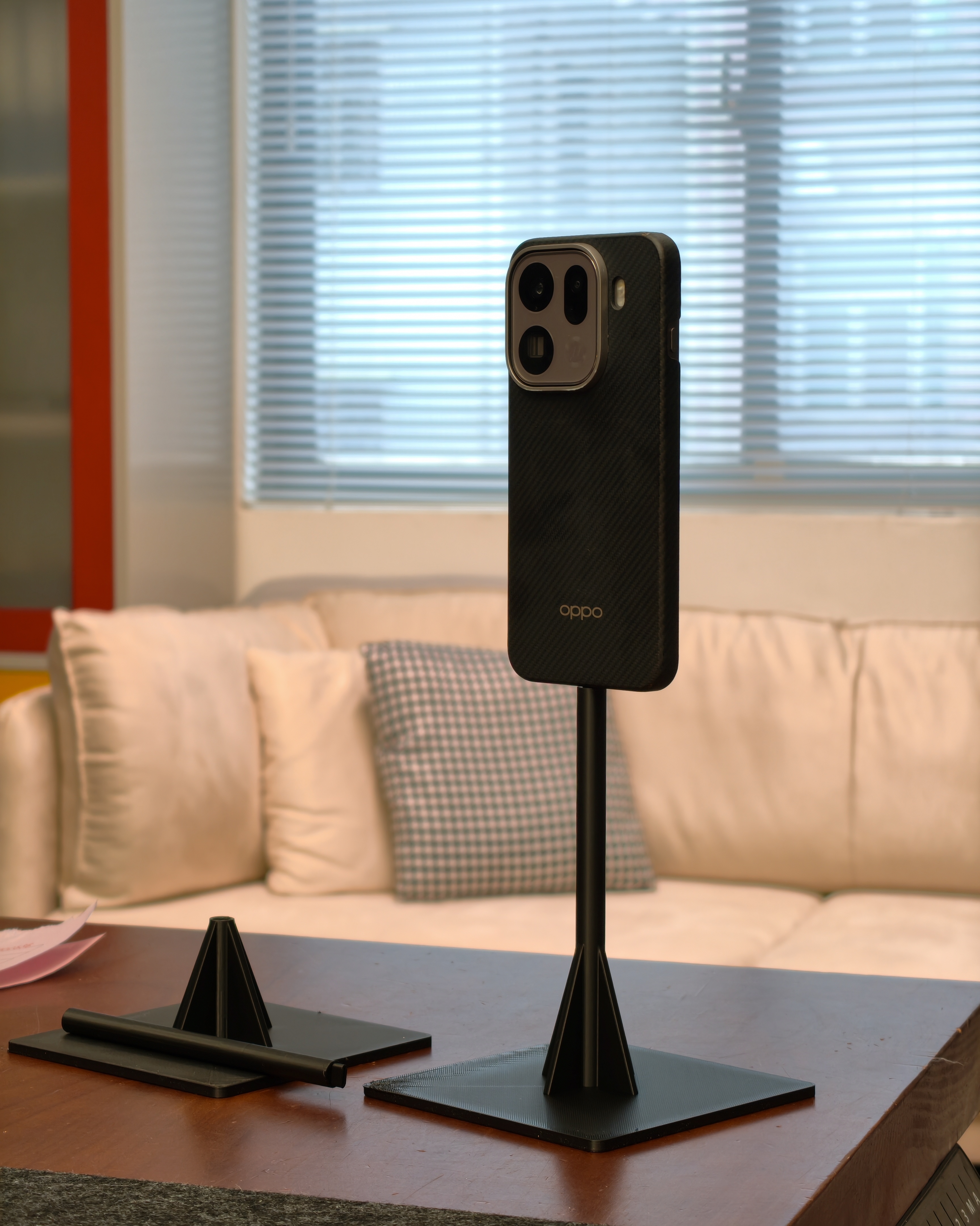 昨天用拓竹3D打印机,打印了两个手机拍摄支架。结果回到家,我又操作了一些打印机,里边托盘自动升高,结果把打印好的东西给顶坏了。我用手机看监控还纳闷儿,顶出去之后怎么能断呢?结果到办公室一看,夹在侧边给掰断了。看后面两张图的效果还不错