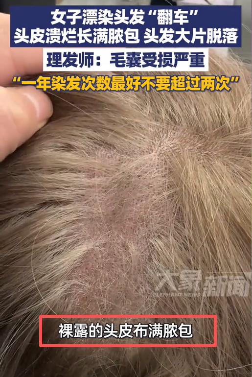 “太吓人了!”上海一女子去理发店染发,理发师掀开她的头发发现,她里面的头发大量脱落,裸露的头皮都是脓包,已经严重溃烂,据悉,女子是在别处漂头发“翻车”,导致头皮受损,说着就开始崩溃大哭。网友:这下后悔了吧!   “这头发我剪不了,你得先去医院。”理发师掀开她外层头发的手猛地一缩,声音里更是压着震惊。他从事美发行业这么长时间,溃烂脱发到让他都无从下手的顾客,真是头回遇到。   因为那早已不能称之为简单的头皮,而是一幅溃烂的地图。此时原本应该健康的头皮上,大片潮湿红肿的皮肤,像被反复灼伤后又泡发了,几缕残余的发丝黏在上面,奄奄一息。最中央的部分,更是露出直接将头皮、毛囊脓包略露在外,令人为之颤栗。   “这是在别的地方,漂头弄坏了……”她声音干涩的试图解释,想要让身后这位发型师为她补救,但话语在事实面前显得苍白无力。   崩溃来得猝不及防,只见女子看到发型师惊愕的眼神,掀开自己头发后颤抖的手指,以及最终拒绝帮忙,要求她去医院治疗的说法。全盘脱出的她,先是倒抽一口冷气,紧接着全身开始控制不住地颤抖,眼泪毫无征兆地涌出。   她抬手想捂住脸,却在半空中僵住,镜子清晰地映照出,她如今令人不敢直视的惨状。店里的闹腾的音乐和吹风机的嗡嗡声此刻好似全部消失了,只剩下她绝望的哭声在回荡。什么新年新发型,什么闺蜜聚会,此刻全都成了最尖锐的讽刺……   爱美之心人皆有之,但在这里小编建议,大家在染发前务必做48小时皮肤过敏测试。选择正规产品与信誉好的理发师,染发时提醒操作者避免染发剂直接接触头皮,可使用头皮隔离产品能在一定程度上提供保护。   当然与此同时,染发频率不宜过高,为保证我们头皮健康程度,建议一年不超过两次。若头皮有伤口或炎症,坚决不要染发!   如果您像文章中女子一样,发质已经受损,那就请立即停止使用任何染烫产品。切勿抓挠或自行挑破脓包。第一时间前往正规医院皮肤科就诊,由专业医生评估损伤程度并进行抗炎、抗感染等治疗。恢复期间严格遵循医嘱,保持头皮清洁与透气,耐心等待头皮自我修复。   最后我们只能说,所有需要你忍受持久疼痛才能换取的美,本质上都是一种伤害。真正的体面,不在于头发是什么颜色,而在于你终于懂得,为自己的头皮与感受,稳稳地坐在了第一位。 对此您怎么看?欢迎大家到下方评论区留言共同讨论。 染发爱美不分年龄,你赞同吗你觉得女人最重要的是美貌还是人品今年春节回家过年吗 信息来源: 大象新闻|2026.1.22《女子漂染头发"翻车"致头皮溃烂长满脓包、头发大片脱落,理发师:毛囊受损严重,提醒:一年染发次数最好不要超过两次》 文|沐琨 编辑|南风意史