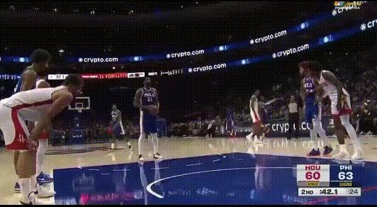 12罚——申京赛中抱怨:恩比德碰都碰不得,一冲就响哨! 图1:“兄弟,他每个动作都吹犯规,碰都碰不得。只要他冲进来,肯定响哨。” 别抱怨,你也这么打他啊!今天2人对位很少,基本是其他人在防(图3-4)。 27+12+4(16中8,罚球12中11),恩比德威力还是在! 图2:精彩脚步