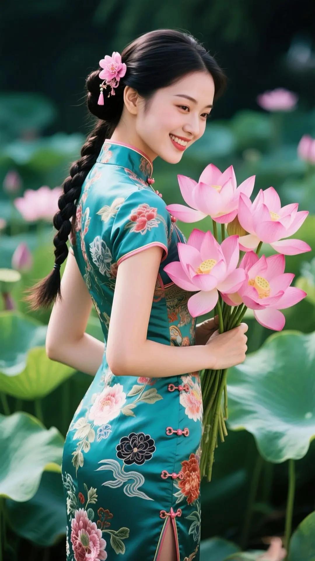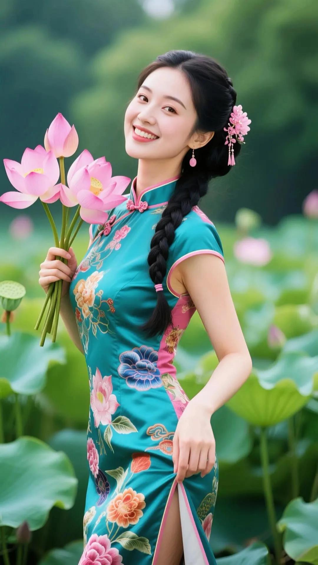 优雅漫步在花海中的旗袍美人