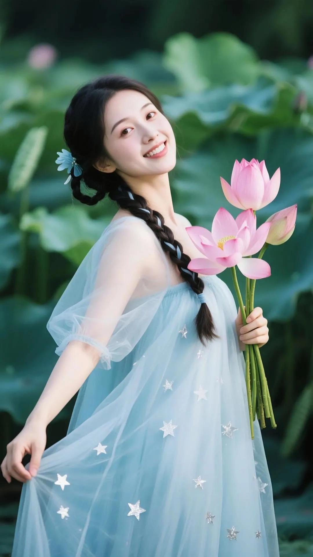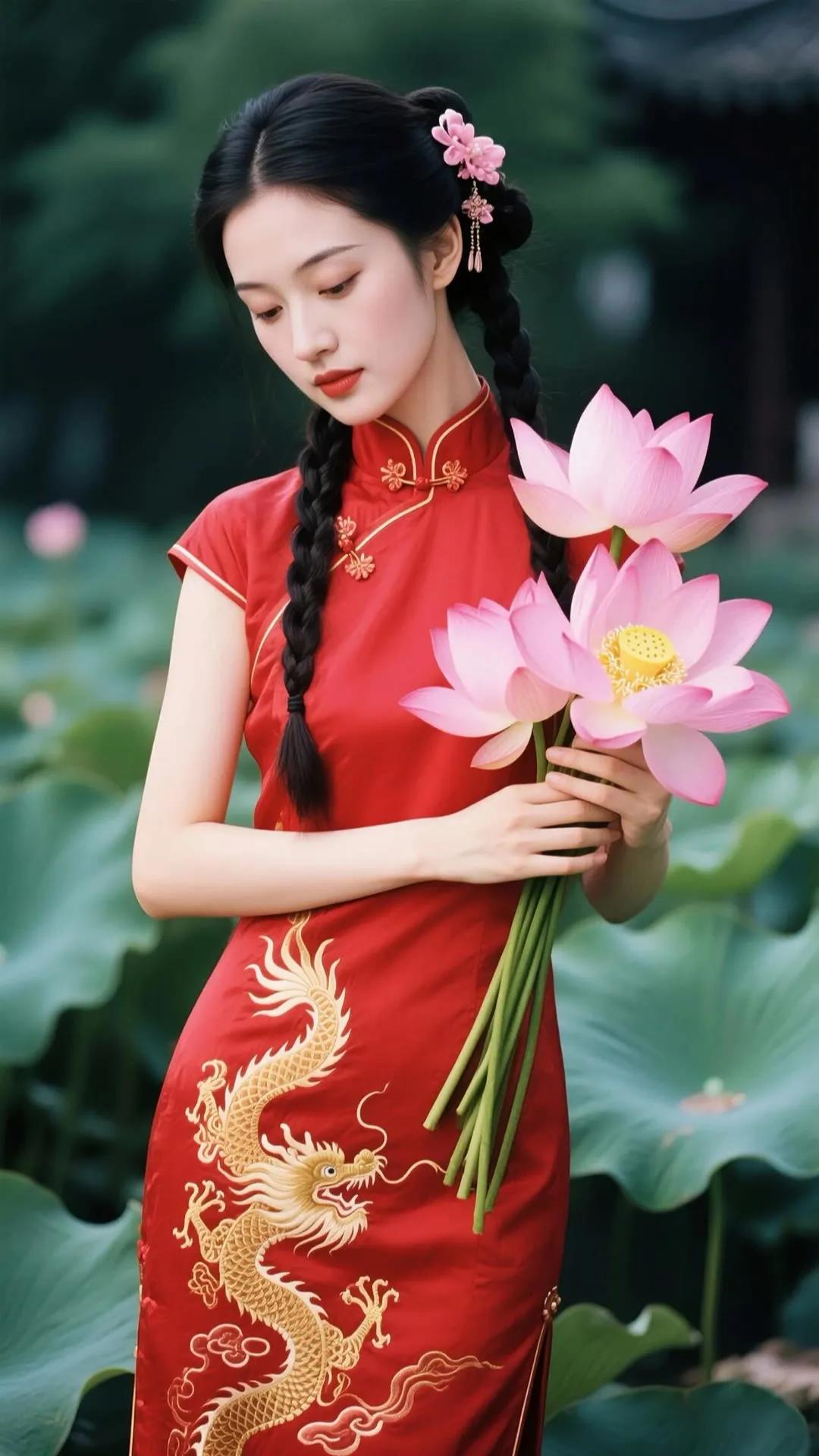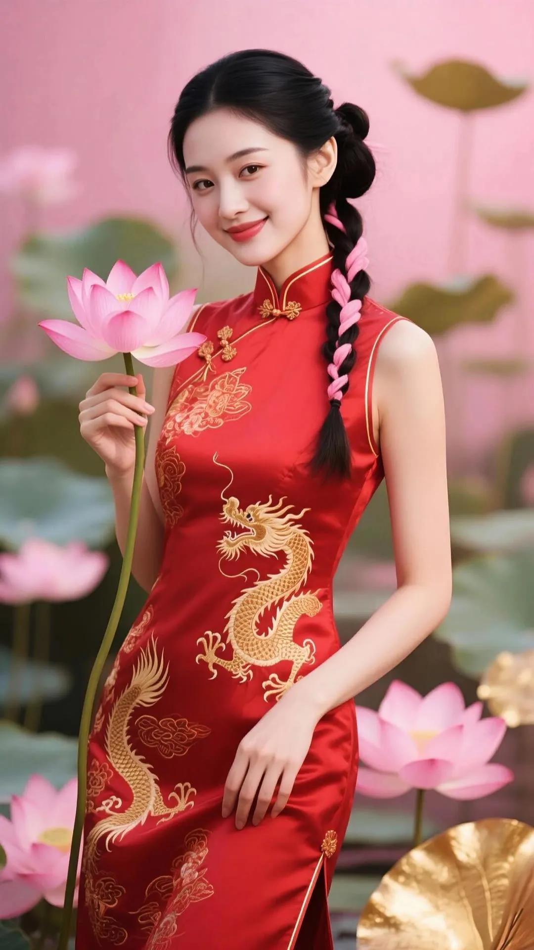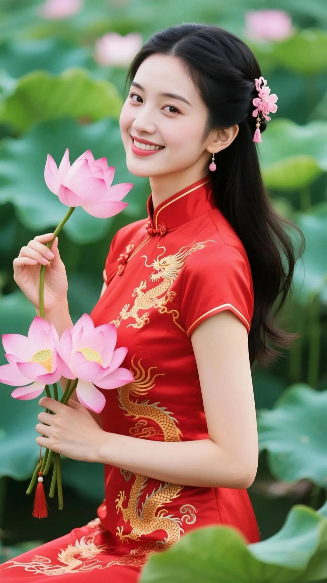 优雅红衣少女,手持莲花,笑靥如花