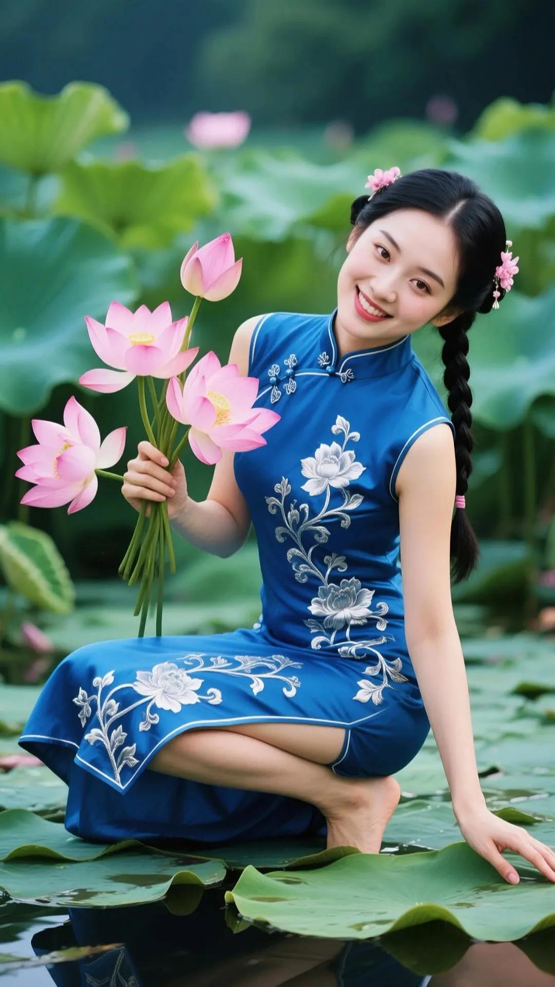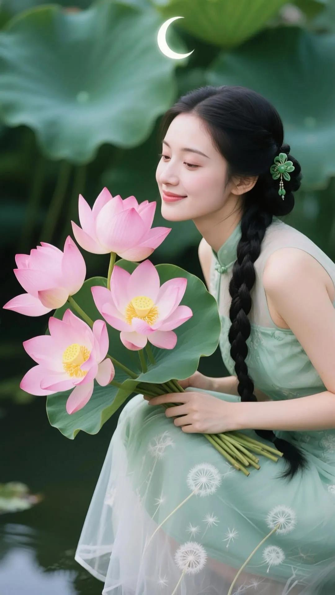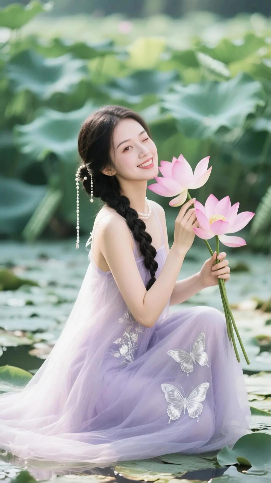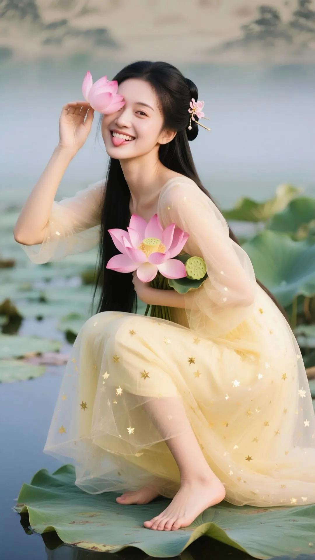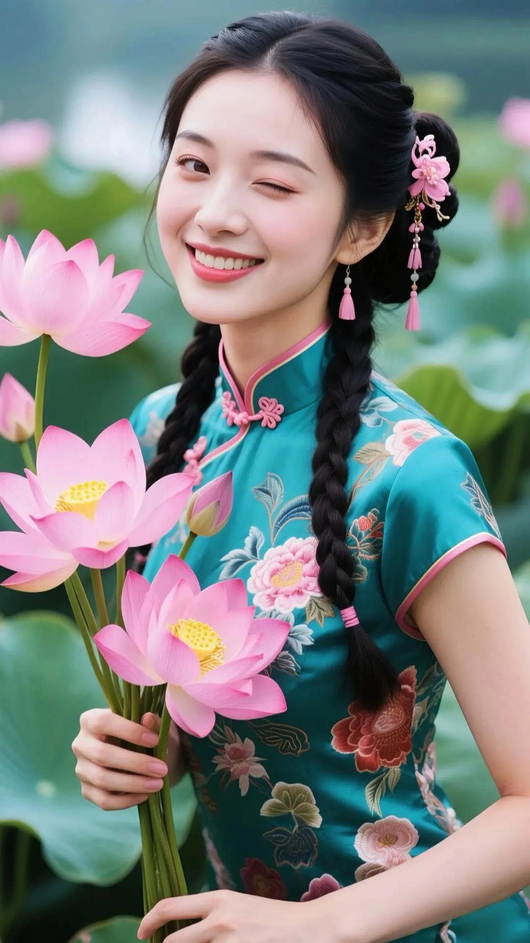 优雅红衣少女,手持莲花,笑靥如花