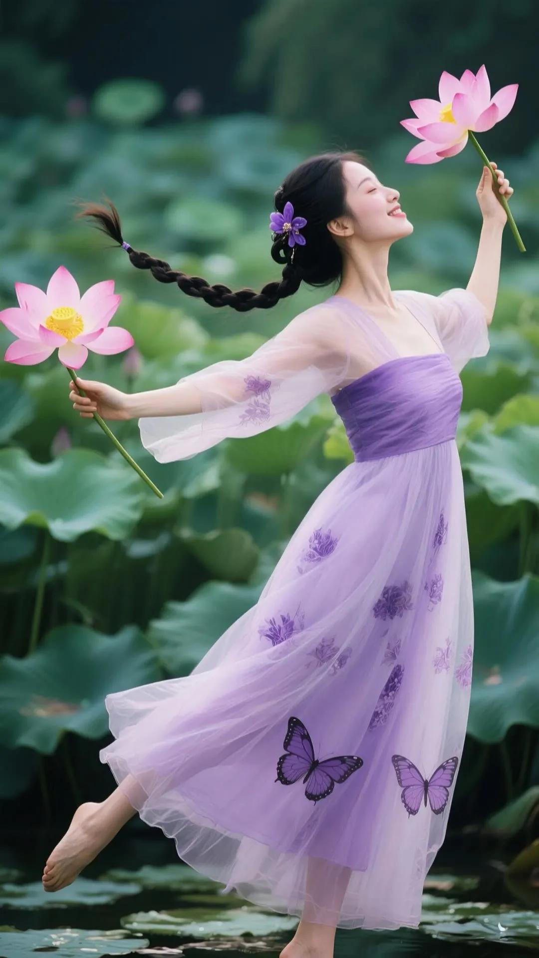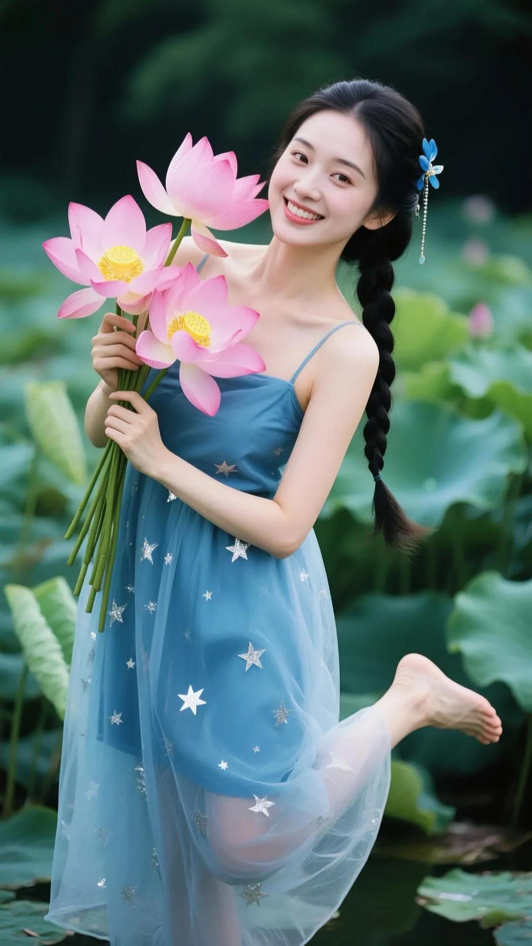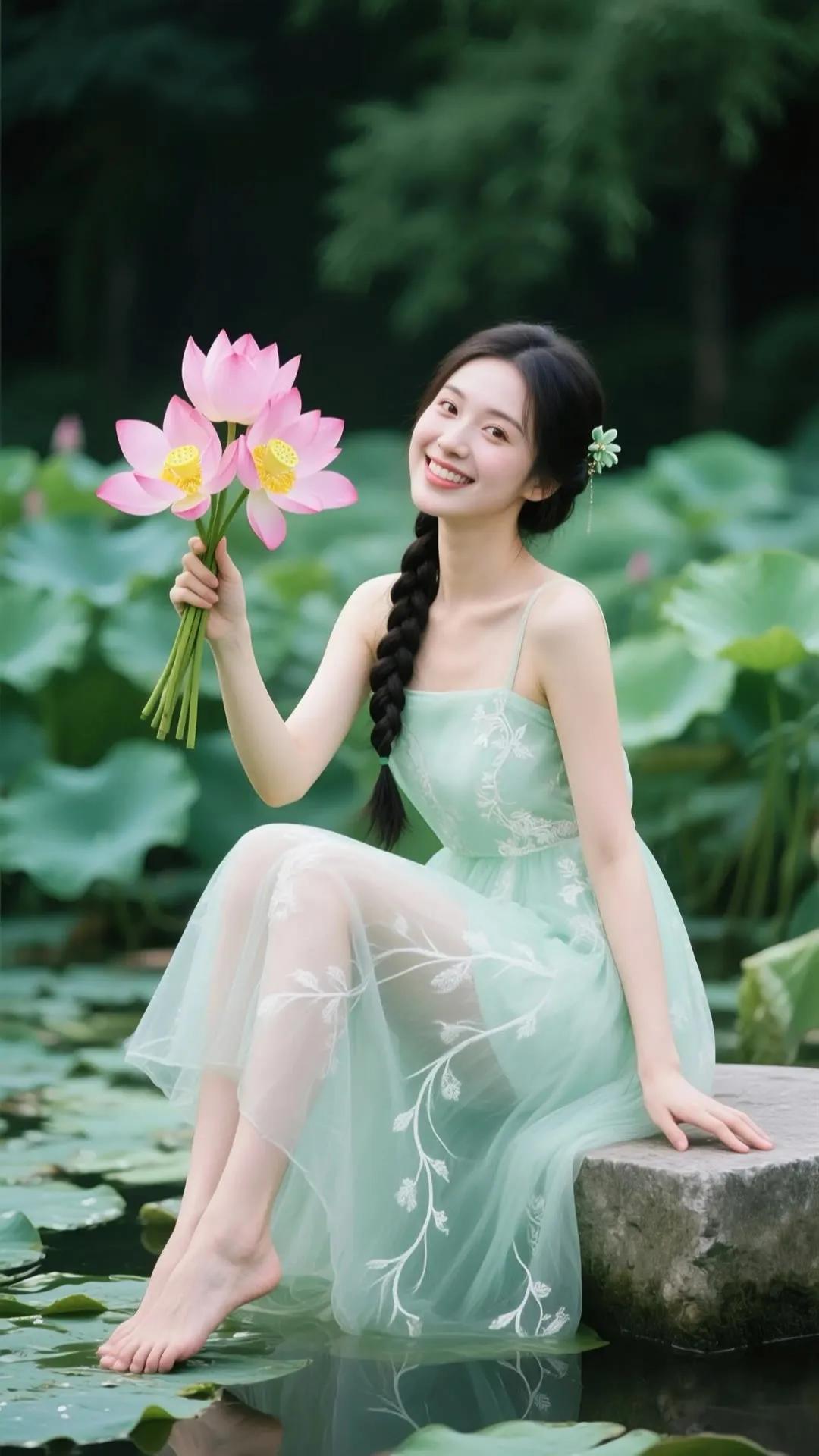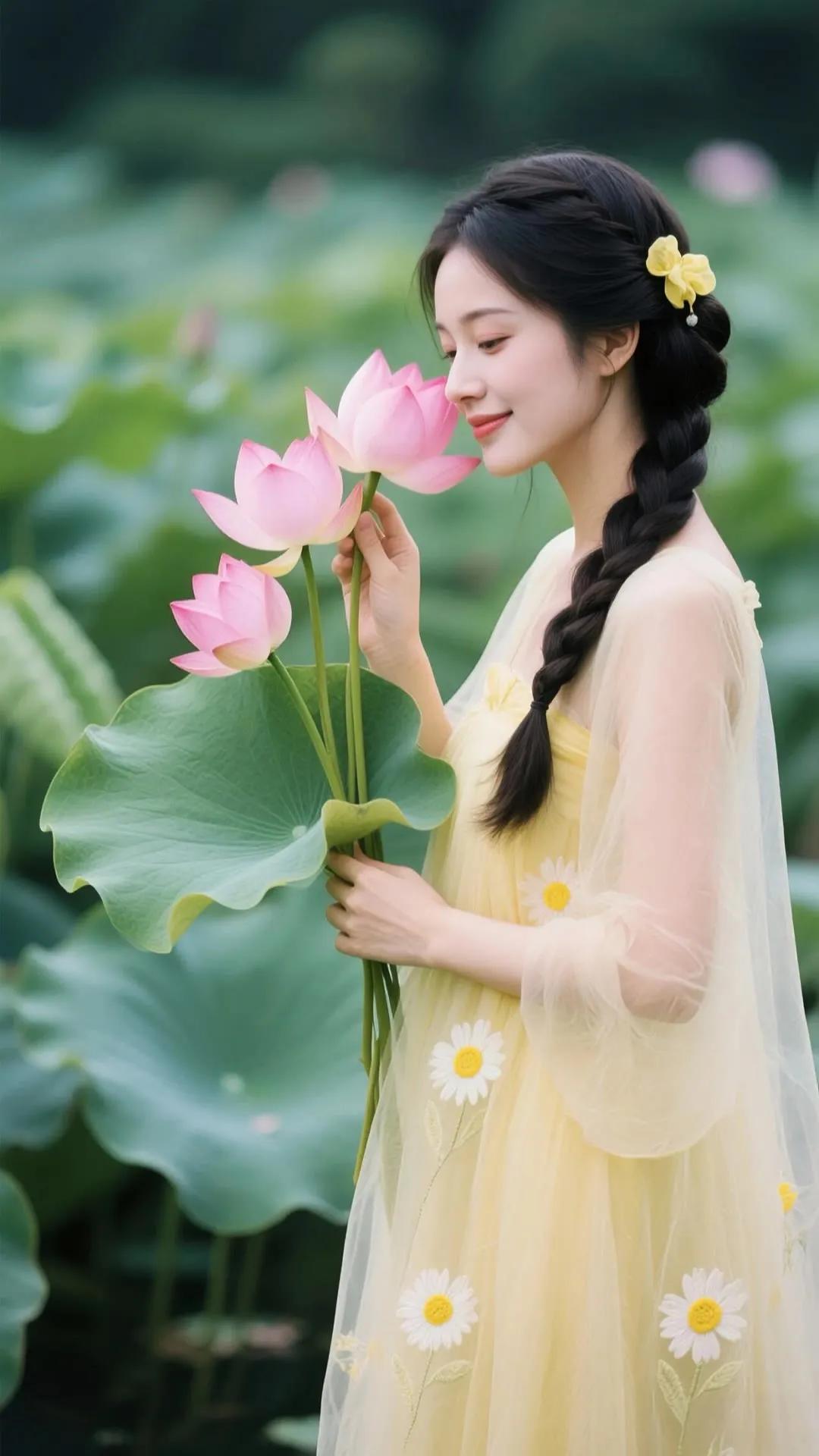 优雅红衣少女,手持莲花,笑靥如花