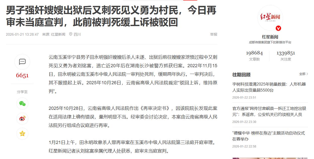 云南,一男子因为贪图亲嫂子的美貌,竟然趁嫂子午睡的时候进入房间侵犯了她。在跟嫂子发生完了关系之后,男子拿着工具胁迫嫂子,不要告诉别人,嫂子可不傻,立刻就拨打了110。被抓之后,男子被关了9年,但是这9年里,他内心一直想着要出来办大事。果然,被放出来之后,男子第一时间就是找自己的大嫂算账。 1996年,那时候田某明才20岁,正是年轻气盛的年纪,可他这股气没用到正地方,反倒盯着自己的亲大嫂起了歪心思,就因为觉得嫂子长得好看,心里那点龌龊的想法就藏不住了。 当年6月的一天晚上,他大哥要去向阳煤矿结账,家里就留了嫂子一个人,田某明瞅准了这个机会,偷偷摸进嫂子家藏了起来,等嫂子睡下之后,就闯进去想要侵犯嫂子。 嫂子惊醒后自然是拼命反抗,可田某明压根不管不顾,还把随身带的跳刀按开,架在嫂子的脖子上,拿杀人来威胁,嫂子迫于无奈,最终被他侵犯了。 干下这等猪狗不如的事,田某明不光没半点愧疚,还怕嫂子把这事说出去让自己没脸,转头就起了歹念,想着干脆把嫂子杀了永绝后患。 没过几天,他就揣着缅刀和跳刀跑到嫂子家,扬言要杀了嫂子,还好被同村的人及时拉开劝阻,这才没酿成更大的祸。 而嫂子这边也没惯着他,自己受了这么大的委屈,哪能就这么算了,直接报了警,警方很快就查清了事实,把田某明的所作所为都摆到了台面上。 1996年9月,法院判了,田某明犯了强奸罪、故意杀人罪还有窝赃罪,数罪并罚,一共判了9年有期徒刑,这一下,他的好日子到头了,只能蹲在监狱里反省。 可谁能想到,这9年监狱生涯,压根没让田某明长半点记性,也没让他反思自己的错,他心里从头到尾就憋着一股邪火,总觉得是嫂子把他送进监狱的,把自己所有的不幸都归到嫂子身上,压根没想过是自己先动的歪心思,先犯的法。 在监狱的9年里,他别的没琢磨,就一门心思想着出去之后要找嫂子算账,还跟自己说要出来办大事,这所谓的大事,说白了就是报复嫂子,让嫂子为当初的报警付出代价,这种想法,简直是没半点做人的底线,连最基本的是非对错都分不清。 2002年7月,田某明因为减刑提前出了狱,按说出狱了就该好好做人,踏踏实实过日子,弥补自己当初的过错,可他偏不,出狱才过了4个月,报复的心思就按捺不住了,第一时间就找自己的大嫂来了。 2002年11月的一天晚上,田某明揣着刀,直接冲到了嫂子家里,就是奔着报复来的。嫂子一看见他拿着刀进来,就知道他没安好心,吓得赶紧从卧室往外跑,田某明就在后面死死追着,嘴里还喊着要报仇。 这时候,同村的村民刘铭富路过,听见嫂子的喊叫声,立马过来阻拦,想着都是一个村的,劝劝田某明别冲动,有话好好说,可谁能想到,田某明已经丧心病狂到了极点,见有人敢拦着自己,二话不说就拿刀朝刘铭富捅了过去,连捅了数刀,刘铭富当场就倒在了地上,最后因为失血性休克没救过来。 杀了人的田某明还没收手,接着追上嫂子,又往嫂子身上捅了好几刀,把嫂子的腹部、手臂都捅伤了,还好被旁边的村民及时拦下,这才没让嫂子也丢了性命,事后嫂子的伤情鉴定出来是轻伤,可身上的伤好治,心里的阴影这辈子怕是都抹不去了。 干下杀人伤人的事之后,田某明知道自己闯了大祸,赶紧跑了,这一跑就是近20年,他以为自己能躲一辈子,以为警方找不到他,可天网恢恢疏而不漏,不管跑多远,犯了法终究是要付出代价的。 2022年,警方在湖南长沙的一个出租屋里,把潜逃了近20年的田某明抓获归案,这起尘封了20年的案子,终于再次提上了日程。 2022年11月,玉溪市中级人民法院一审宣判,田某明犯故意杀人罪,判处死刑缓期两年执行,剥夺政治权利终身。 可田某明到这时候还嘴硬,不服这个判决,提起了上诉,还狡辩说刘铭富的死是过失,说是嫂子把刘铭富推到了他的刀上,可尸检报告明明白白写着,刘铭富有两处深至胸腔的致命刀伤,是被大力捅刺导致的,根本不是他说的那样,他的狡辩压根站不住脚。 云南省高级人民法院二审的时候,检方直接驳斥了他的说法,说他犯罪动机卑劣,主观恶性极深,还是累犯,应该从重处罚,最后二审裁定驳回上诉,维持了死缓的原判。 本以为这事就这么定了,可到了2025年10月,云南省高级人民法院发现这起案子原判在适用法律上有错误,量刑明显不当,又决定启动再审。 2026年1月21日,这起案子在玉溪市中级人民法院再审开庭,检方在庭审中直接建议改判田某明死刑立即执行,目前案子还没有当庭宣判,不过明眼人都能看出来,田某明的所作所为,早就够得上重判了。 这事儿到现在,两个家庭都因为田某明的恶行支离破碎,刘铭富无辜丧命,留下家人痛苦半生,嫂子这些年活在恐惧和阴影里,身上的伤疤时时刻刻提醒着她当年的遭遇,而田某明自己,从一开始的贪图美色犯下强奸罪,到后来的报复杀人,一步步把自己逼上了绝路,全都是自己一手造成的。