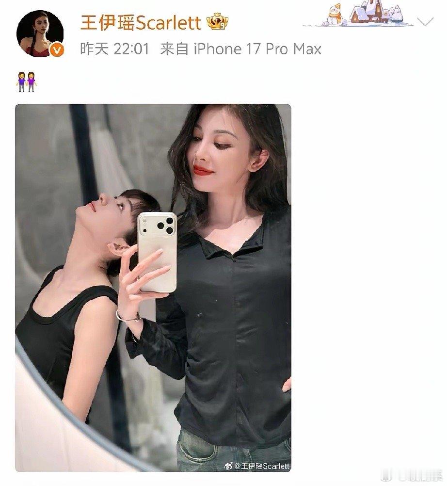 太棒了,王伊瑶又又又发了赵丽颖的私照。赵丽颖的嫡长闺王伊瑶深夜发了一张合照,赵丽颖穿着黑色吊带松弛感满满,仰着头侧面看起来太嫩了,好有少女感。王伊瑶则是穿了黑色的西衬衫,看起来好man。王伊瑶和赵丽颖合作《小城大事》,俩人私底下超十年的感情实在是太好了,鲜活的赵丽颖还得看王伊瑶的社交圈。