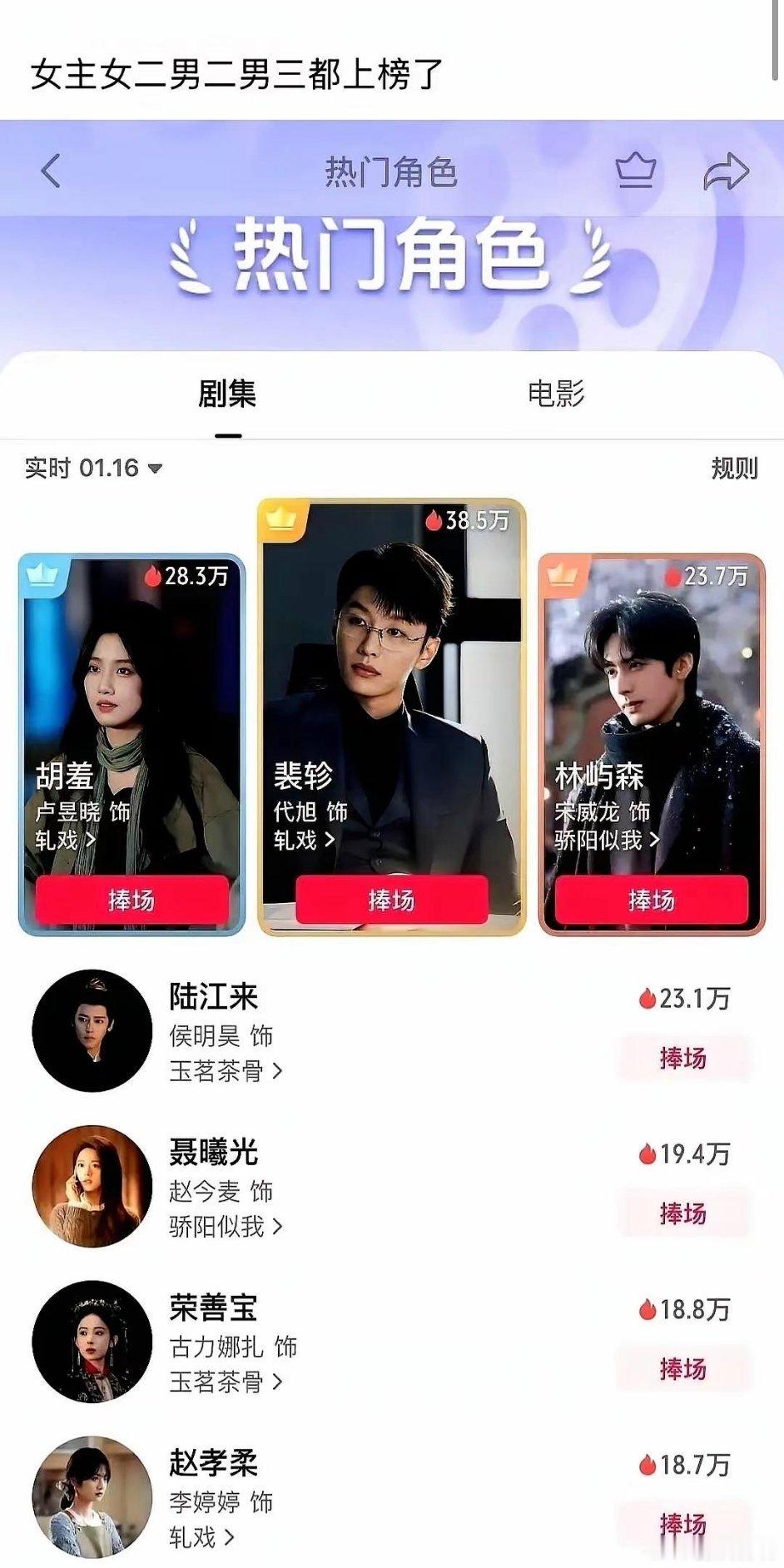 男主数据直接挂零,这剧火得有点邪门。说的是爱奇艺热播的《轧戏》,陈星旭演的男主肖稚宇,在角色热度榜上居然查无此人。反倒是代旭演的男二裴轸,直接冲到榜首,人气断层领先了。那个30秒的电梯初遇戏简直封神啊,一句台词没有,光靠眼神就把那种禁欲又拉满的张力演活了。还有卢昱晓演的女主胡羞,独立又清醒,职场戏看得人直呼过瘾。看来温柔守护的完美人设真不香了,观众现在就爱这种有层次、有血肉的角色。这数据太真实了,大家直接用拇指投票了呢。你们是更吃哪种人设?