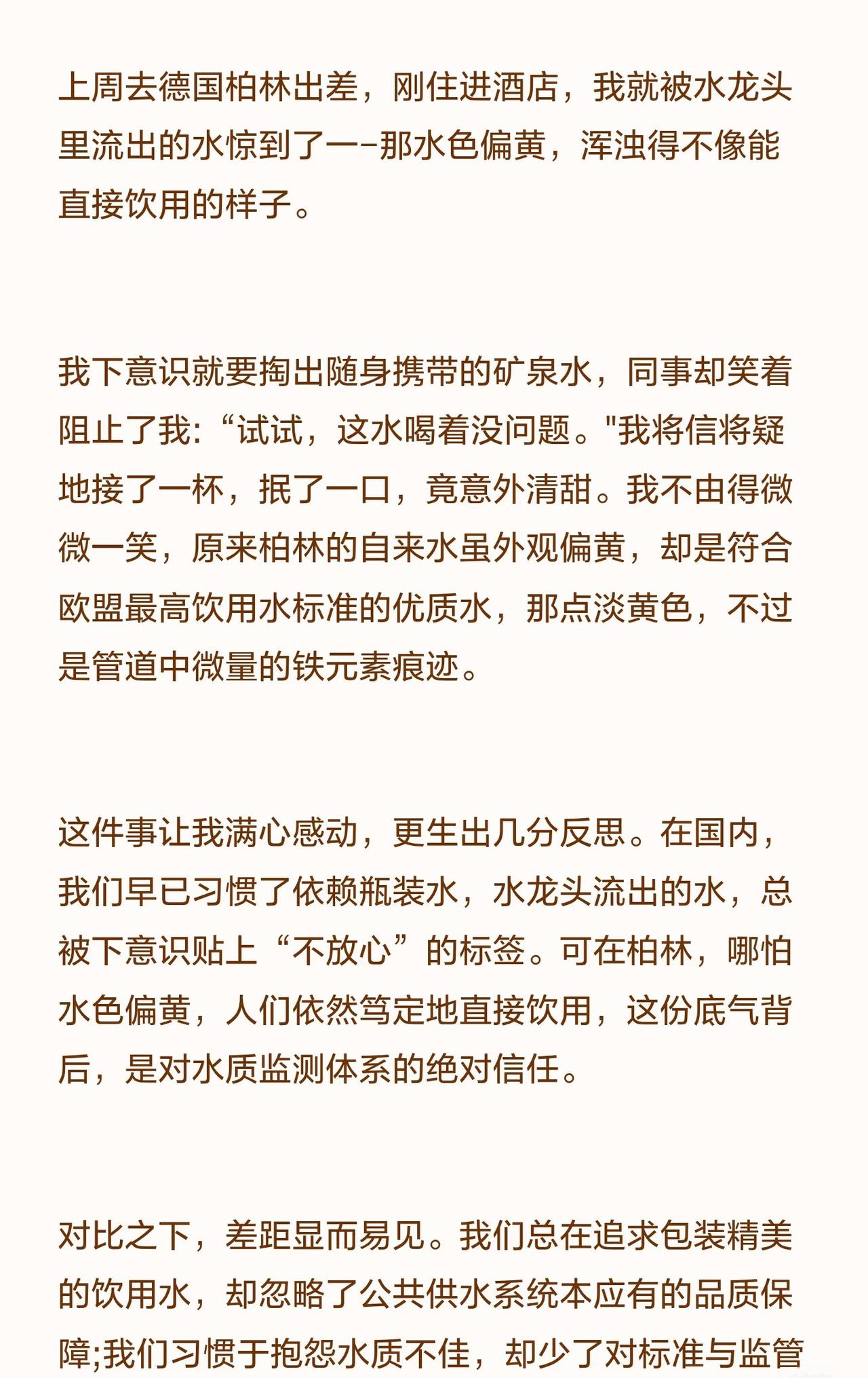 “德国浑浊的自来水是香甜的” 这个去的德国出差的人开始反思上了,刚开始看到浑浊的自来水,他很嫌弃,后来听同事说可以喝的之后,吹嘘喝起来很香甜,是欧盟最高的水质标准,并吐槽对国内的水不放心,大家都不敢直接喝 结果评论区在德国的网友怼他:我喝了德国的水都快秃了