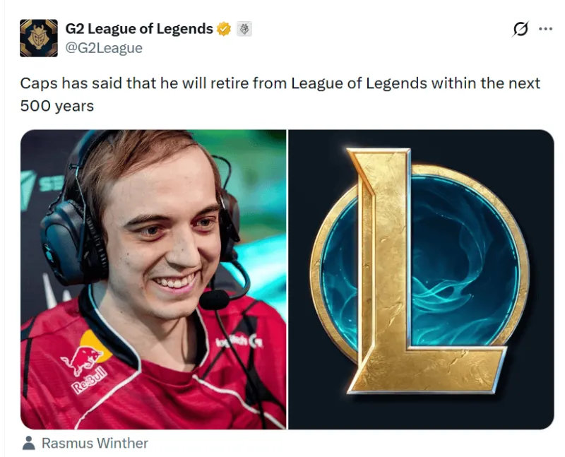 整活还得看兔宝!G2官推公布Caps退役时间,直言:“Caps说他将在未来500年内告别英雄联盟!”细数Caps的荣誉——15座联赛冠军、1座MSI冠军、两次全球总决赛亚军,今年很有机会入选名人堂。不过老帽年纪也不小了,今年已经26岁,或许真的离退役那天不远了。caps英雄联盟2026LPL第一赛段