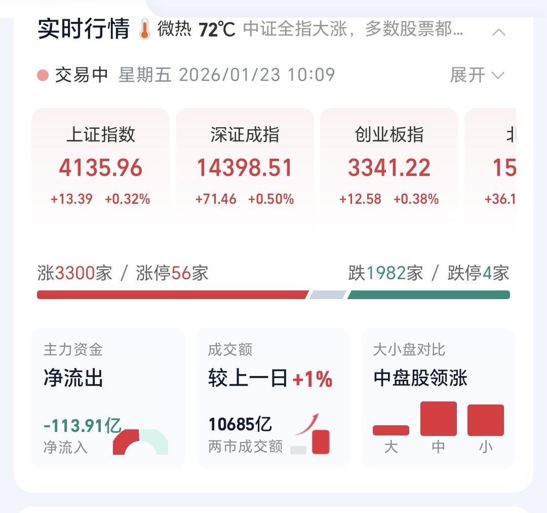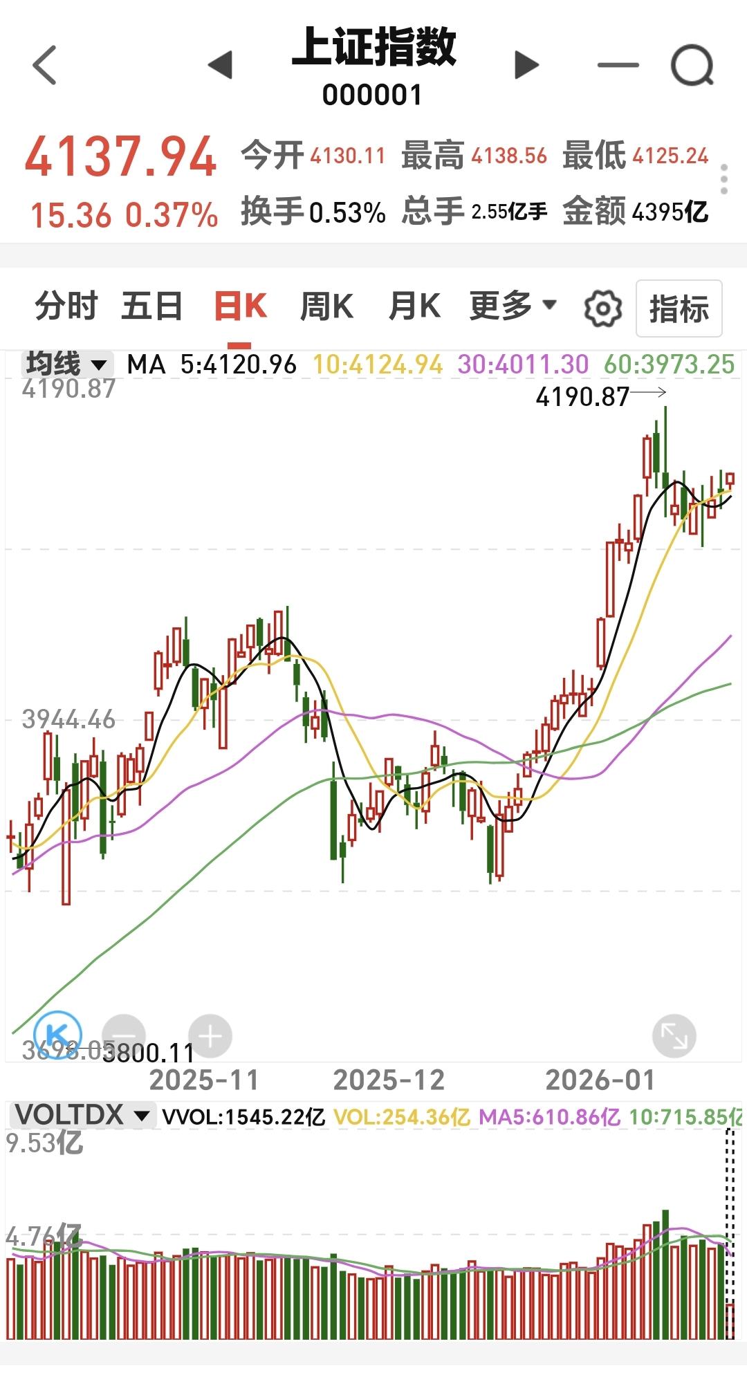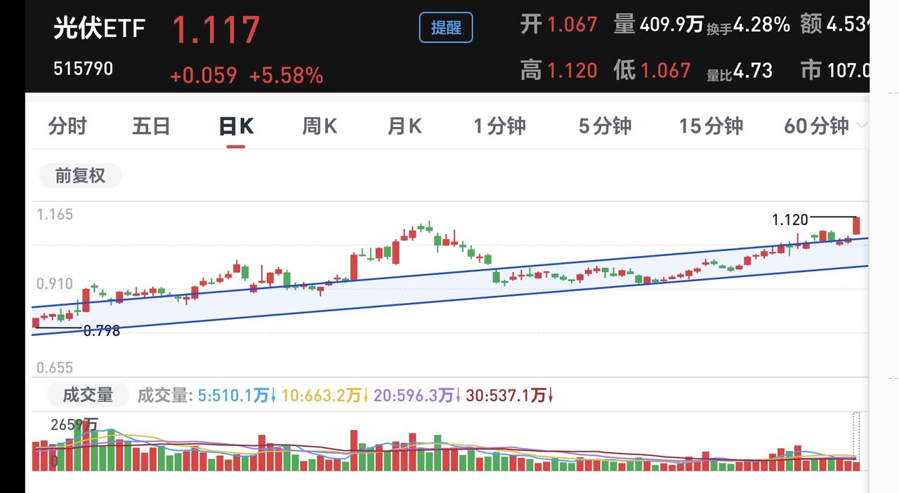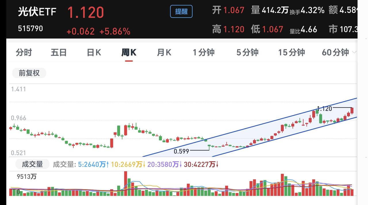 基金:光伏板块大涨应该怎么办 今天市场高开以后小幅度震荡,三大指数的上涨幅度都不大,黄色线在蓝色线上方两条线之间的敞口还可以,两市累计成交10685亿,相比于昨天同期放量了1%,基本上就是一个平量,这样的情况之下,今天大概率还是震荡走势。 现在上涨幅度最大的三个板块是:光伏板块,白银板块,商业航天板块。 看下面的截图5,这是光伏板块日K线图,今天的上涨突破了上涨通道的上轨,又一次进入加速上涨走势,前段时间有过一次加速,但后来又回到了上涨通道内,但即使是回到了上涨通道内,它也是处于上涨趋势中,只要是处于上涨趋势中,就可以继续持有。 看下面的截图六,这是光伏板块周开形图,现在的位置处于周线级别上涨通道中,长线持有的人继续持有,除非跌破上涨通道的下轨,才可以考虑要不要止盈出来观望。 光伏板块日线级别处于加速上涨中,周线级别处于上涨趋势中,这样的情况下没有理由不继续持有,操作需要有依据,而不是想当然,而不是今天涨多了就需要出来,上涨幅度越大越不需要出来,也就是急涨不错,急跌不进。 就像昨天的创新药板块,昨天创新药没有下影线,是一个没有下影线的下跌,今天有位朋友留言说,被我吓得昨天没有敢进场,但是今天涨了,这不是我吓得你不敢进场,是你自己没有进场,你自己的判断错了,你没有判断出老杨的判断是错误的,我的观点你们也是需要判断的,我的观点不一定都是正确,还有可能今天看判断是错误的,明天看判断有可能就是正确的。 大家帮忙评论,点赞,转发,分享,谢谢大家!