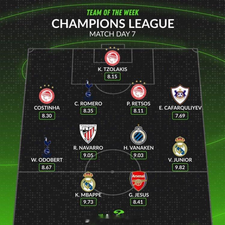 欧冠联赛阶段第7轮比赛战罢,WhoScored列出本轮最佳阵容,枪手热苏斯在列,