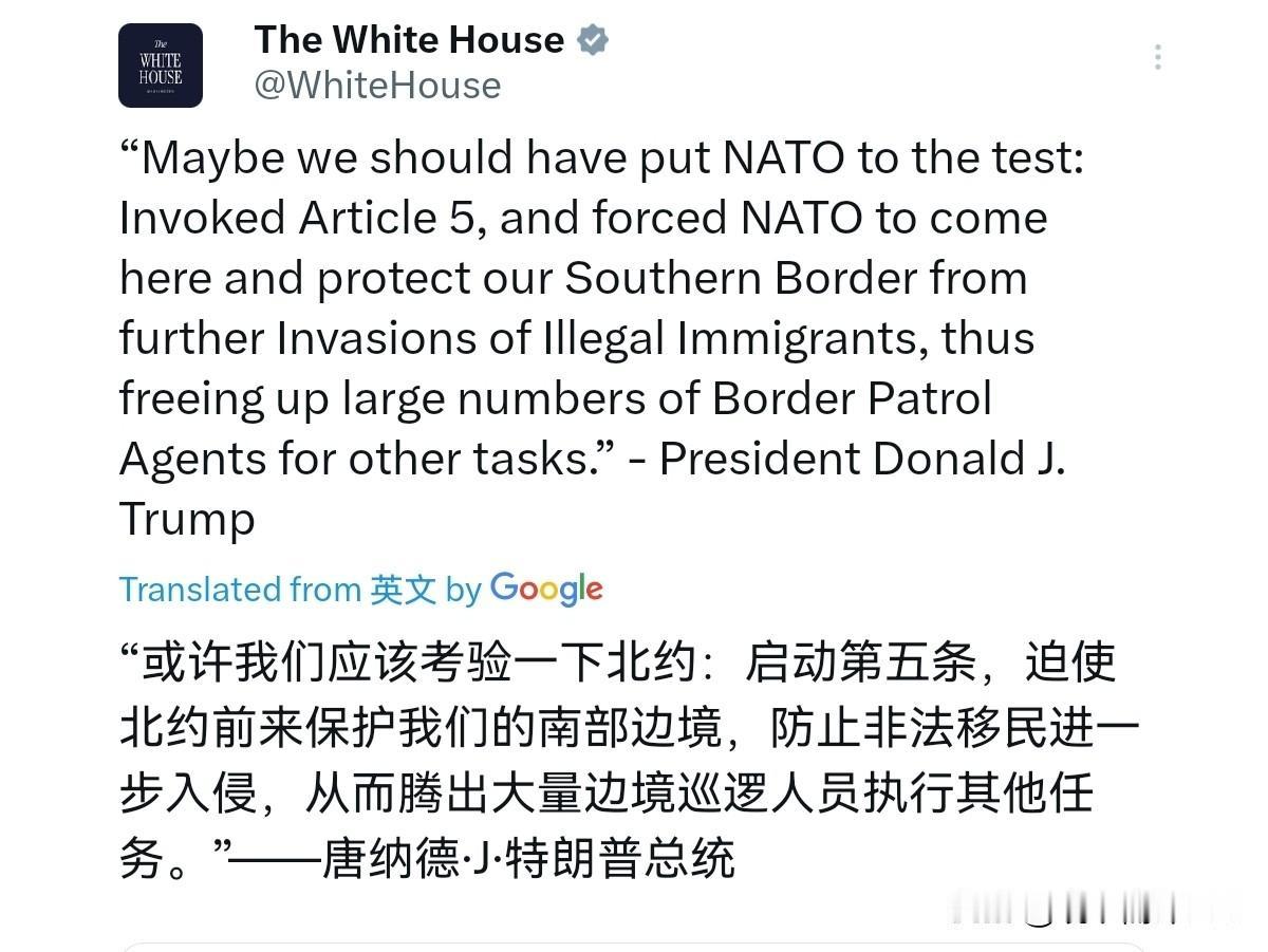 特朗普是真精明!这样反向一思考,格局完全打开了!1月23日,特朗普写到,也许我们应该考验北约:援引第5条,迫使北约来到这里,保护我们的南部边境不受非法移民的进一步入侵,从而释放大量边境巡逻人员来执行其他任务。不得不说,特朗普的这一奇思妙想,真是一个“商业奇才”,反向思考之后,格局完全打开了。 特朗普的意思是什么呢?那就是既然北约是一个盟友之间的互帮互助的组织,那为什么现在北约盟友们就不能帮一帮美国解决一下美国面对的问题呢?特朗普的意思很清楚,北约也到了援引第五条来帮助美国打击非法移民的时候了。说实话,现在特朗普这样想,特朗普今后完全有可能这样干。 要说启动北约第五条,北约成立以来只启动过一次,那就是911恐怖袭击之后,美国的盟友们帮助美国打击基地组织。但是,要盟友们动用军队过来帮美国打击非法移民,这听起来确实有点离谱。打击非法移民,这顶多属于警察干的活,哪里用得着出动军队。但既然特朗普脑洞大开,反向要搭盟友们的便车,这恐怕也没什么不可以。