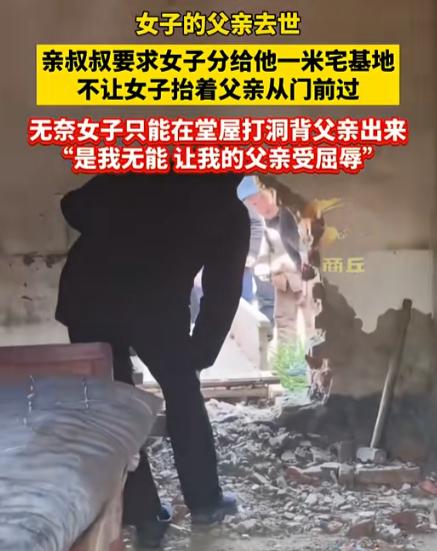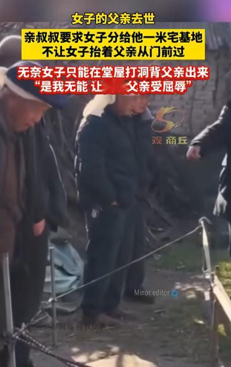 [微风]本是同根生,相煎何太急!一女子父亲去世,亲叔叔用宅基地要挟,拦着不让出殡,女子无奈从堂屋砸洞,将父亲从洞中抬出来。女子痛哭:我无能,让父亲受辱了。   这事一传出来,很多人第一反应就是俩字:太狠了,叔叔是真把脸撕到一点不剩。 亲哥刚断气,人还停在家里,连土都没下呢,他就带着自己两个儿子,直接把村口一堵,张嘴就要一米宅基地,还撂下狠话:不把地给他、不签字画押,棺材今天别想出村。 话说得一点余地都不留,摆明了就是要趁丧事下死手。 可真要细琢磨,这事绝不只是“一米地”这么简单。说白了,这叔叔心里打的算盘特别清楚。 他认准了一点:侄女是嫁出去的女儿,人在城里,早晚不回来,这老家的房子和地放着也是放着。 趁着亲哥去世、家里最乱、最没人撑腰的时候下手,用老一套“女儿不是自家人”的说法压人,这地要过来就是白赚。他这不是要地,是想直接把这一家吃干抹净。 更让人寒心的是,当初这两家盖房子的时候,情况完全反过来。 那会儿去世的这位大哥,为了方便两家进出,主动让了半米地基出来,算是情分到位了。 叔叔当时还拉着哥哥的手,说有这样的兄弟是福气,结果呢?如今人尸骨未寒,他就翻脸不认人,踩着亲哥的后事来算账,吃相难看得让人不忍直视。 现场是什么样子?自家门口,女儿已经哭得站都站不稳,嗓子喊哑了,人抖得厉害,跪在地上求,说只要让她爹安安稳稳走完这一程,她怎么都行。 可叔叔呢?一副冷脸,寸步不让,他那两个儿子横着膀子站在路中间,像两堵墙一样,把出村的路堵得死死的。 村支书赶过来调解,嘴都说干了,一遍一遍讲“人死为大”“先让老人下葬再说别的”。 可叔叔根本不听,直接来一句:“死人争什么地?活人说了算。” 围观的乡亲越聚越多,有人摇头叹气,有人偷偷抹眼泪,但真敢上去劝架的,一个都没有。 大家心里都明白,这种事一旦掺和进去,后面麻烦没完没了。 眼看天一点点黑下来,下葬的时辰马上就要错过,再拖下去,人都没法安顿。 就在所有人都以为要僵死在这儿的时候,女儿突然不哭了。 她从地上站起来,脸上的泪随手一抹,转身冲进屋里,对着帮忙的亲戚吼了一句:“把后墙砸了,我背我爸走!” 这话一出来,现场的人全愣了。 谁都没想到,这个刚才还哭到快崩溃的姑娘,能下这么狠的决心。 没一会儿,大锤抡起来了,几下下去,土墙被硬生生砸出一个大洞,冷风呼地一下灌进屋里,灵前的白布被吹得乱晃,看着让人心里直发酸。 女儿又跪下来,和乡亲一起把父亲抬上担架,就从这新砸出来的洞口往外走。 没有唢呐,没有热闹,也没有纸钱满天飞,就那么几个人,踩着泥泞的小路,一步一挪往坟地走。 女儿走在最前头,身上全是灰土,嘴里一遍遍地念着,说是自己没本事,让父亲走得这么艰难。 堵在前门的叔叔看见这一幕,脸色一下就变了,他估计怎么都没想到,这个平时看着好说话的侄女,真敢把墙砸了出殡。 这一下,他不光地没要到,脸也彻底丢光了,围观的乡亲终于忍不住了,开始指指点点,说为了点地,连亲哥出殡都拦,实在不像个人样。 可最扎心的,还不只是这一幕,丧事办完,女儿终究还是要回城里过自己的日子。 可那面被砸穿的墙,就像这段亲情一样,已经断得干干净净,再也补不回去了,她后来也说,不是有多恨叔叔,只是后悔当初没早点把宅基地确权办清楚。 可这事真能怪她吗?法律早就写得明明白白,子女不分男女,都有继承权,房子和地是合法遗产,谁也没资格强抢。 可偏偏在一些地方,“吃绝户”“外嫁女没份”这些老观念,比法律还硬,成了某些人抢东西时最顺手的借口。 说到底,就是看准了人家是女儿,觉得好欺负,好拿捏。 更讽刺的是,这些人往往忘得一干二净:当年让地的是谁,床前伺候到最后的是谁,真到分利益的时候,血缘情分,全都不值一提。 为了点地,亲情能烂到这个地步,实在让人心里堵得慌。 信源:观商丘