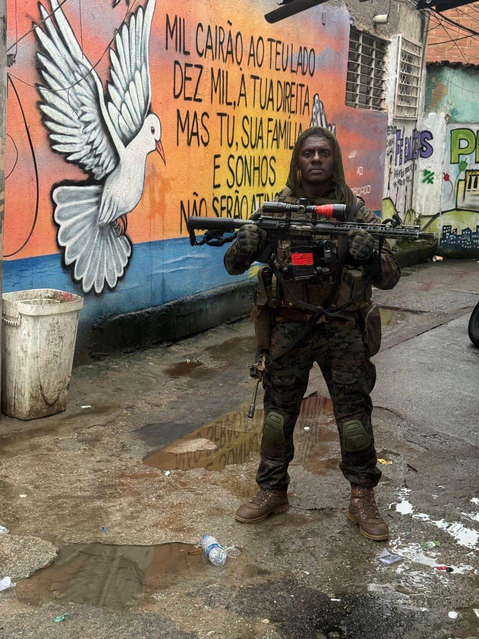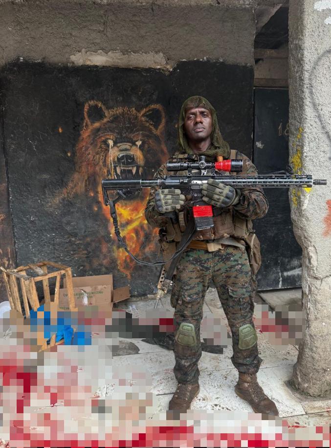 以下是里约热内卢州瓦尔热姆佩克纳市塞萨尔·马亚和科罗阿多(CV)社区突击行动后,特警队员的记录。该行动共击毙4名毒贩,缴获3支手枪和1支步枪 2026 年 1 月 22 日里约热内卢塞萨尔·马亚和科罗阿多贫民窟发生突袭事件后,一名特警队员的照片。据警方声明证实,此次行动击毙了四名“红色突击队”贩毒分子,并缴获了一支步枪和三支手枪。 照片捕捉到身穿战术装备的特工置身于血泊和 BOPE 熊涂鸦之中,一幅以和平为主题的壁画,突显了贫民窟环境中暴力与社区象征之间的鲜明对比。