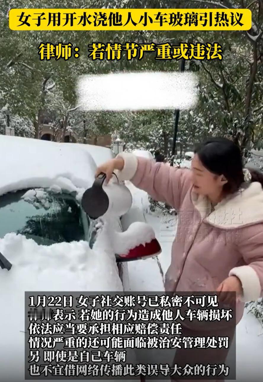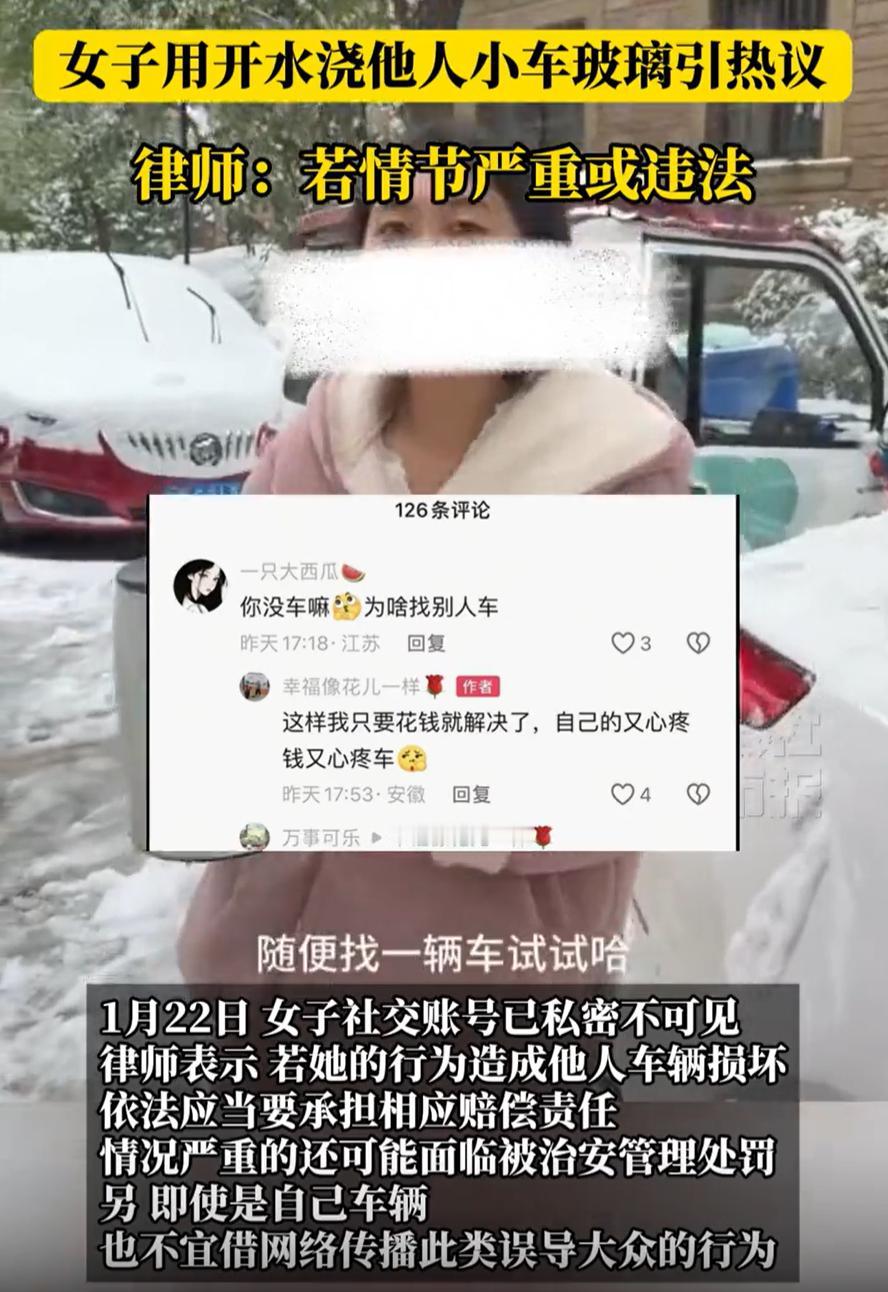 无知者无畏!安徽,一女子拍视频,为了流量竟然拿着一壶开水去往别人的车上浇,结果视频“翻车”,事情闹大后女子连忙改口称不是找的随机车辆,而是妹妹的车,但网友依然不买账 视频中,女子穿着睡衣就出门了,手里提着一壶开水,外面地上还积着雪。她说要做一个测试:看看用开水浇在结冰的车玻璃上,玻璃会不会裂。而且强调要随机找一辆车,接着,她就找了一辆被雪盖住的小车,把一整壶开水直接淋了上去。视频最后,能清楚地听到玻璃“咔嚓”一声,视频随即戛然而止 这不就是故意损坏别人财产吗?视频发出来,网友一下全炸了。眼看事情闹大了,这女子赶紧出来“澄清”,说那不是随机找的别人的车,是她妹妹的车,是自家人的车,意思就是没关系 这话说出来,网友更不信了。先不说这话是真是假,就算是自己亲妹妹的车,就能这么糟蹋吗?更何况,她一开始拍视频的时候,明明就是想制造一种“随机搞破坏”的刺激感来博眼球,现在出事了才改口,这态度本身就有问题 有网友说得很直白:不管是谁的车,这种行为本身就不对。如果真是陌生人的车,那就涉及故意毁坏财物;就算是自家车,这种为了流量刻意制造危险、误导他人的内容,也是扰乱网络秩序。网络不是法外之地,不是你想怎么演就怎么演的。 说句实话,这种“测试”,明知道开水浇冷玻璃有风险,还是要做。如果真的想知道答案,方法多的是,可以查资料,可以咨询专业人士,甚至可以自己用废旧玻璃做实验。可她偏偏选择在公共场合,拿别人的车(或声称是家人的车)直接动手。这已经不是无知,而是一种对他人财产、对公序良俗的漠视 退一步讲,就算车是妹妹的,得到了妹妹的同意,这种视频内容导向就好吗?它传递给观众的是什么信号?是“遇到车窗结冰可以泼开水”的错误方法?还是“为了拍视频可以随意处置物品”的任性态度?这种内容多了,甚至可能误导一些缺乏判断力的人去模仿,造成实实在在的损失 由此来看,女子这次可能真的给自己惹麻烦了