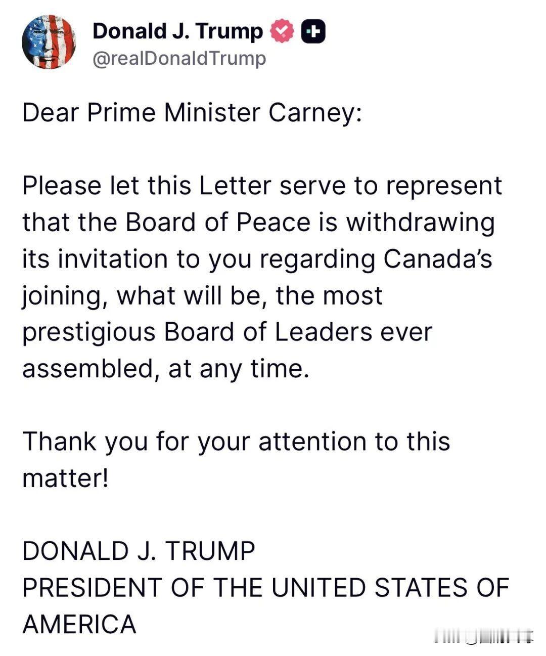 加拿大已经失去了加入“和平委员会”的资格!特朗普22日晚在社交媒体上说,已撤回对加拿大总理卡尼加入“和平委员会”的邀请。原因其实很简单,特朗普说加拿大全靠美国,卡尼对此不服,抨击了特朗普,并且表示加拿大全是靠自己。卡尼的话,显然引起了特朗普的反感,于是他就撤回了邀请。理论上说,加拿大目前已经失去了加入的资格。但我认为,卡尼不必惊慌,因为目前加入的国家,都是小国,五常中的其余四常都没有加入,欧洲主要国家也没加入。所以,即便没了资格,也没什么大不了的。建议,卡尼趁此机会,带领加拿大彻底向东看!