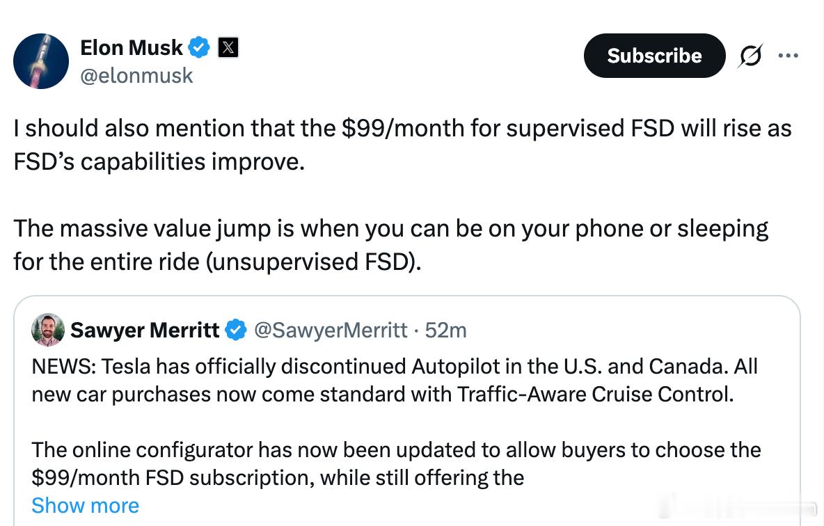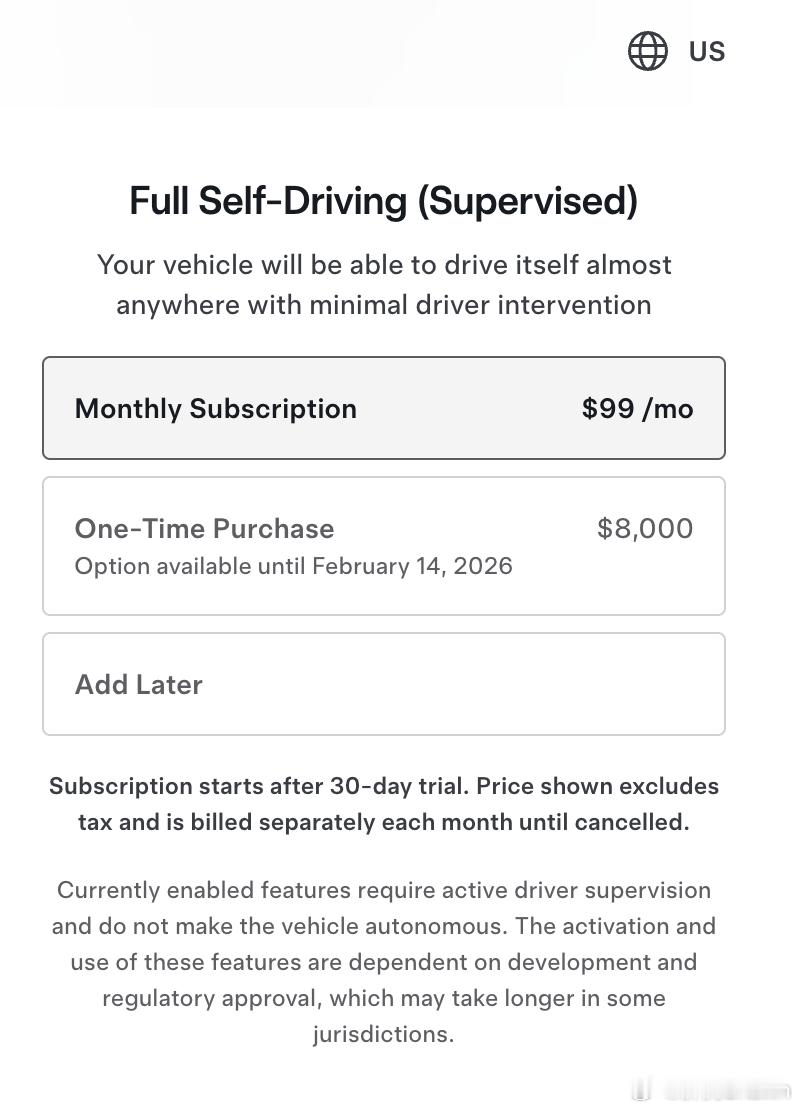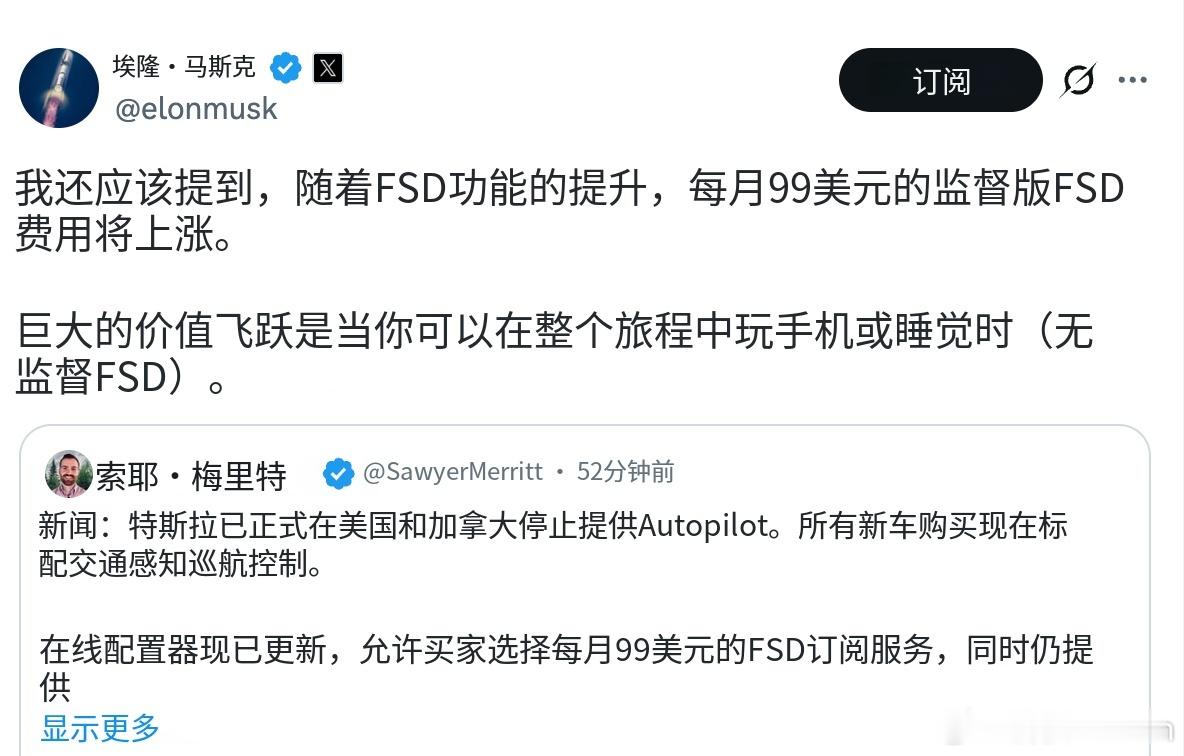 好好好,原来不给买断的意思是为了以后涨价?另外现在北美特斯拉官网,取消了ap的介绍页面,直接就是订阅/买断fsd/稍后再说特斯拉