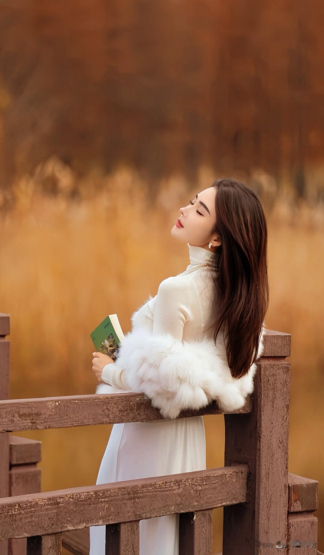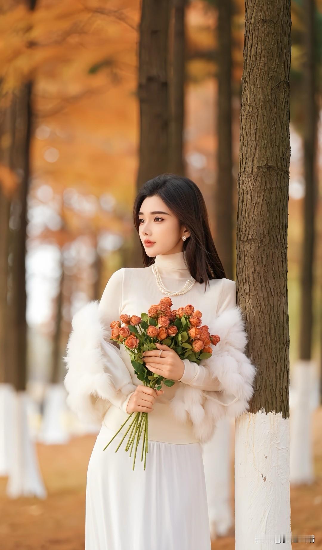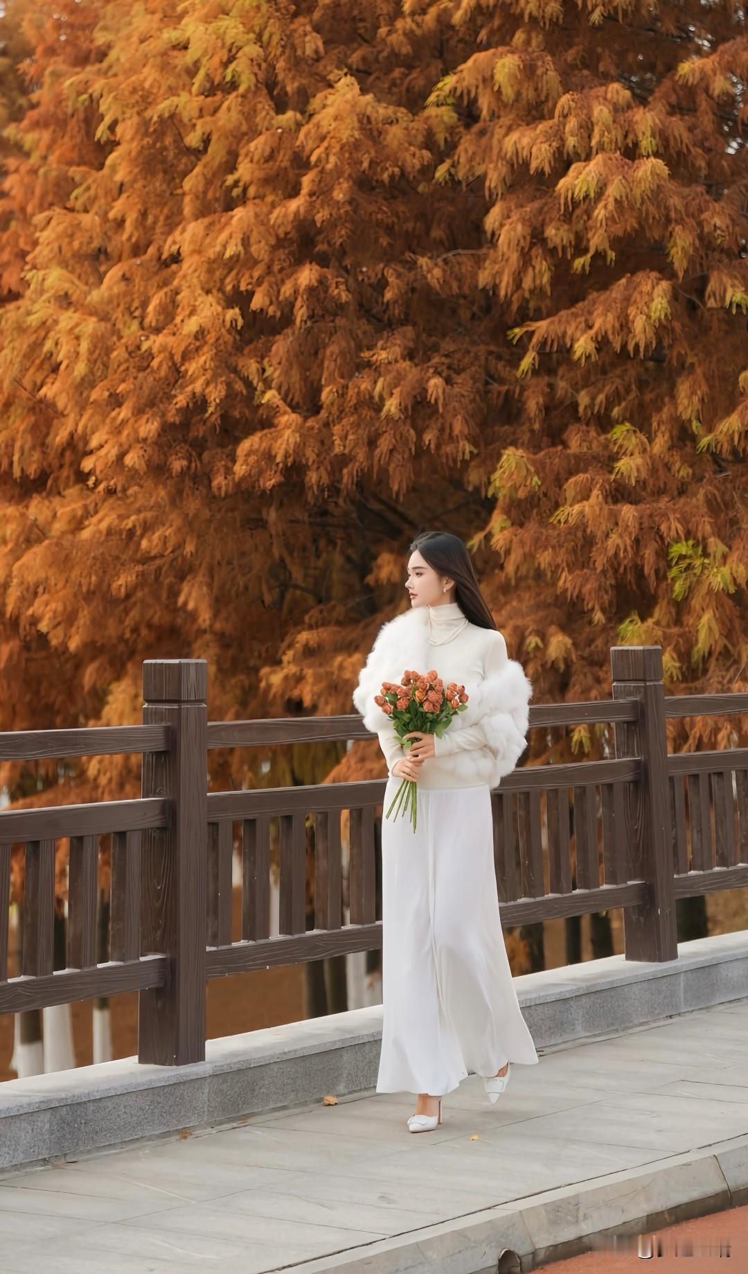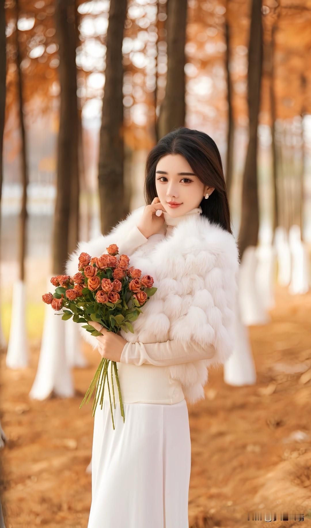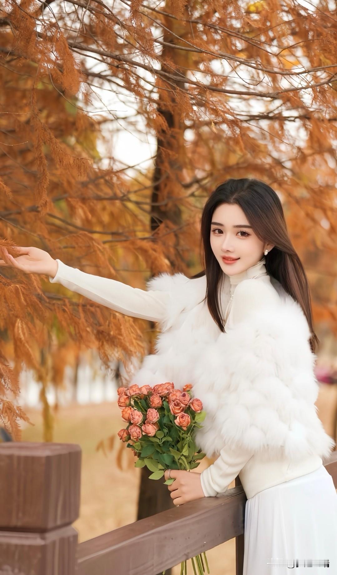 秋日漫步,手持玫瑰,感受自然的温柔与美好。