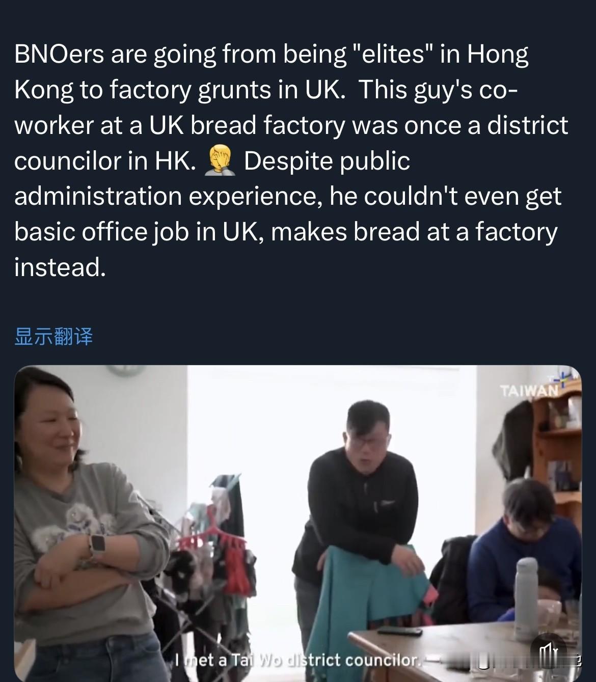 在香港是“精英”的所谓“英国海外公民”(持BNO护照的港人)如今却沦落到在英国工厂做苦力,这位香港男士在英国就是这样的遭遇,他曾经是香港的区议员。 尽管拥有公共行政方面的经验,他却连一份办公室文员的工作都找不到,最终只能在面包厂打工。 当然,在工厂工作本身并没啥。但客观来说,落差会非常大,与他们期待的某些港媒所描绘的“英国美好生活”截然不同。在面包厂工作,是一份入门级工作,工资不高。 不过,他或许认为英国才是他真正的家,也算求仁得仁吧。需要指出的是,这些天真的港人一直不明白,他们可能是优先顺序中的最后一类。优先顺序依次是:英国白人、其他有色人种英国人、合法白人移民、合法非白人移民、非法移民和寻求庇护者,最后才是BNO护照持有者,也就是“英国国民(海外)签证持有者”。
