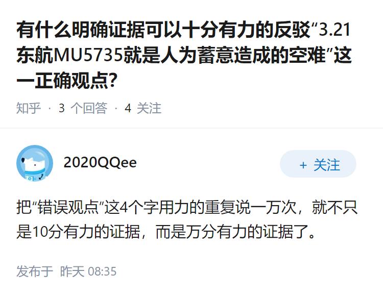 有什么明确证据可以十分有力的反驳“3.21东航MU5735就是人为蓄意造成的空难”这一正确观点?