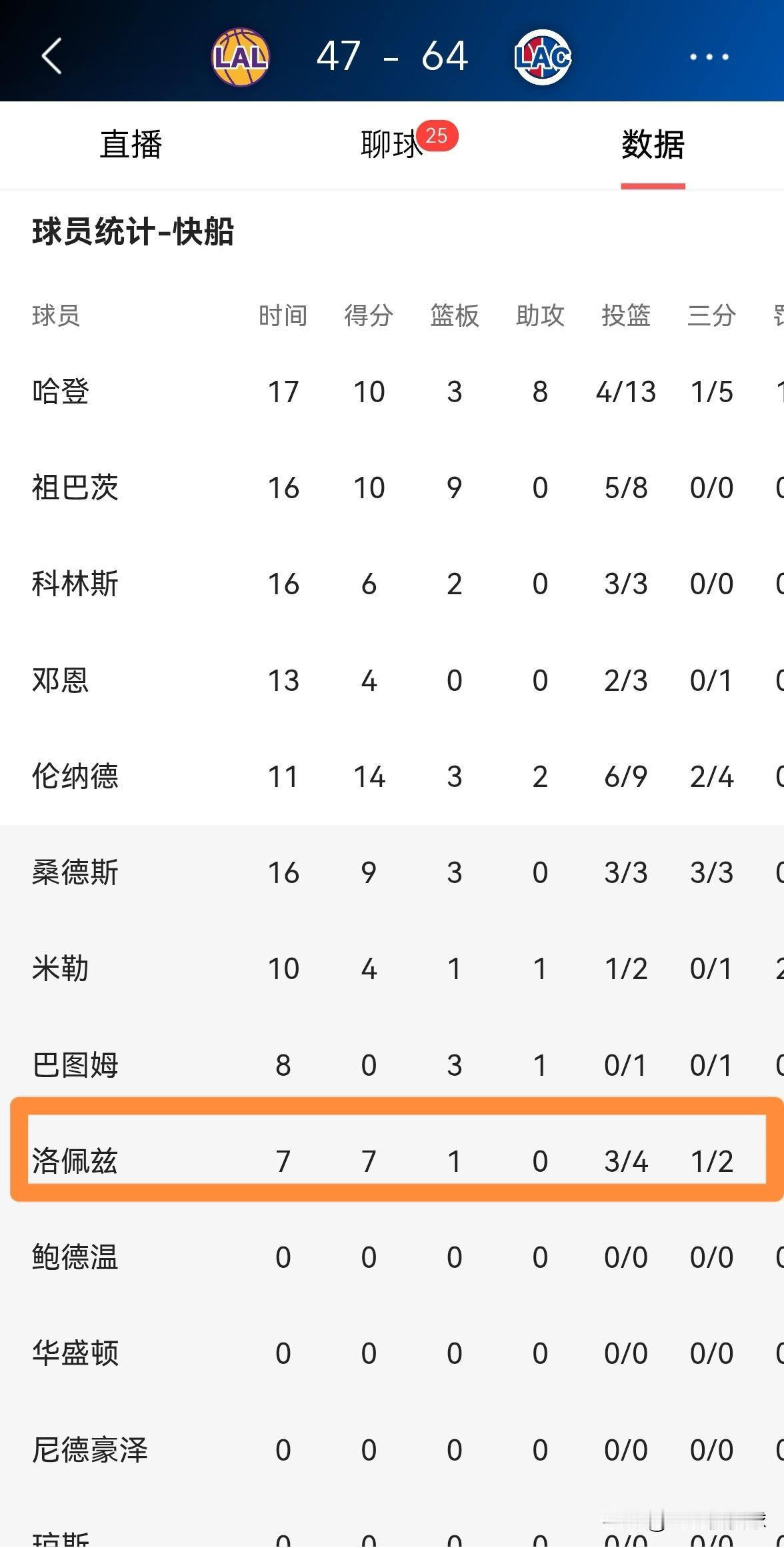 快船老将洛佩兹真是太让人意外了!在今天快船主场迎战湖人的焦点战中,目前双方的上半场比赛已经结束,快船以64:47领先对手17分,可以说形势非常不错。在前两节比赛中,洛佩兹一反常态竟然手感火热,他在替补出战的7分钟里,投篮4中3,其中三分球2中1非常高效的得到7分,还有1篮板,他的场上正负值为+4。 对于快船和快船球迷来说,我相信他们一定特别希望洛佩兹经常打出这样的意外表现。
