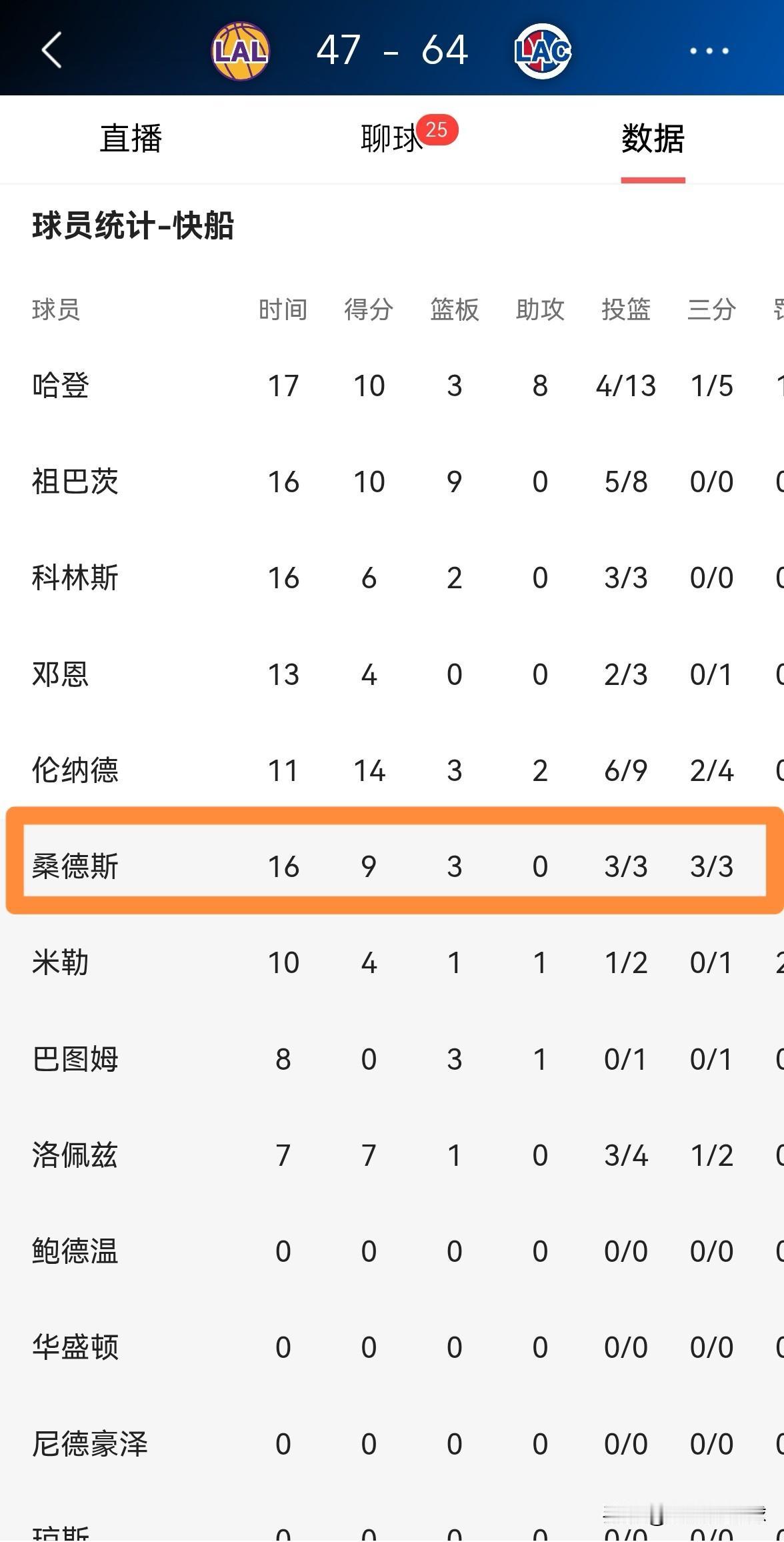 快船新星桑德斯总是能给人带来惊喜!在今天进行的快船和湖人的比赛中,目前双方的上半场比赛已经结束,快船以64:47领先对手。在前两节比赛中,桑德斯替补出战16分钟,三分球3中3得到9分3篮板1抢断,他的场上正负值为全队最高的+16。 本场比赛由于伦纳德的伤愈复出,因此桑德斯再次回到了替补阵容,事实证明桑德斯在替补出场以后给球队带来了非常大的帮助。
