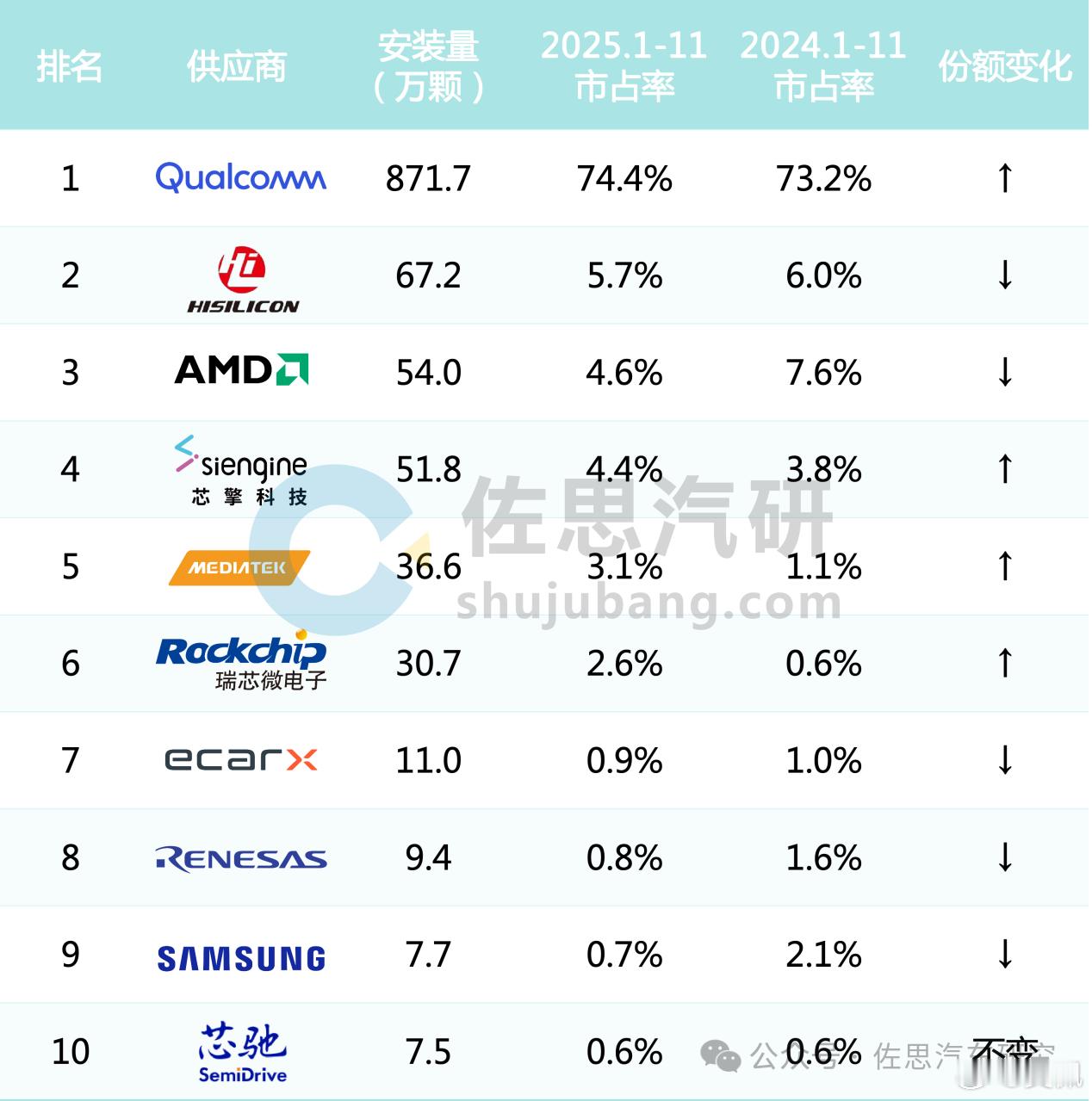 车机芯片2025年的盘面基本就是“傍大款”:除了高通一如既往是大哥,华为海思靠鸿蒙智行五界和各个Hi模式车,AMD除了smart等几个外主要靠特斯拉,芯擎+亿咖通靠吉利,瑞萨电子(Renesas)主要靠合资品牌还没切高通的那点市场,而芯驰则主要靠自主品牌中低端车型。联发科上来很快,连发两块S1 Ultra和P1 Ultra的3nm和4nm芯片,还打算干舱驾一体,可能会冲上去。2026年,你觉得谁有机会挑战高通?比亚迪的自研芯片也快了……大V聊车新能源大牛说中国智造图片来自