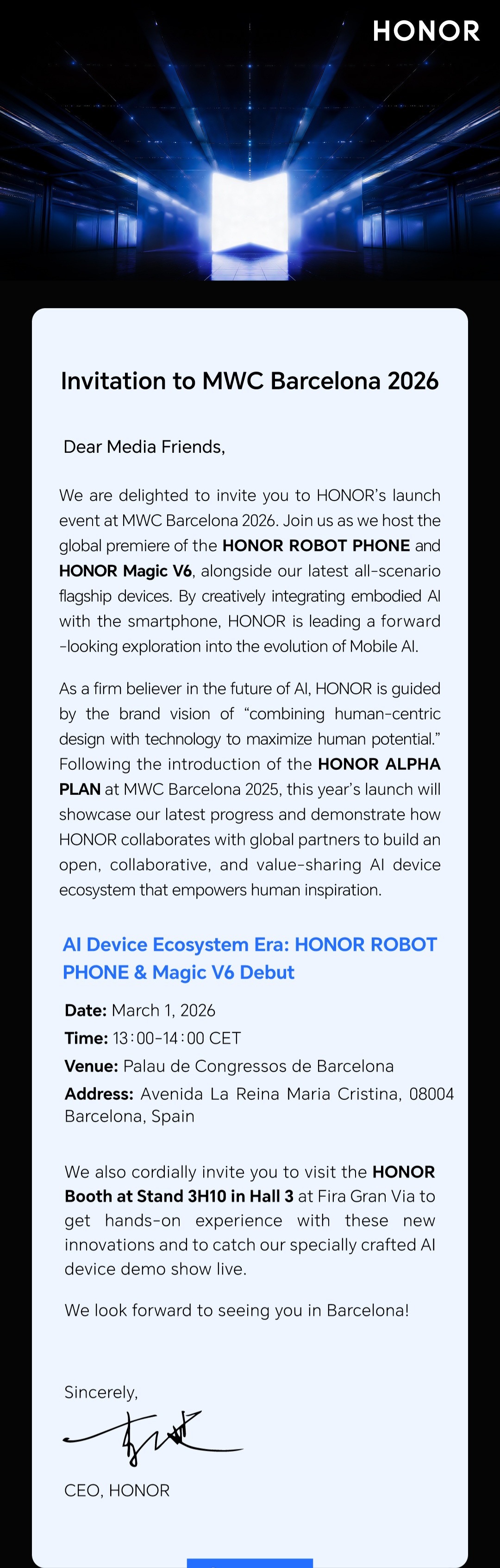 荣耀3月1日将在2026 MWC上公布Robot Phone和Magic V6最新信息,到时候一起巴展见