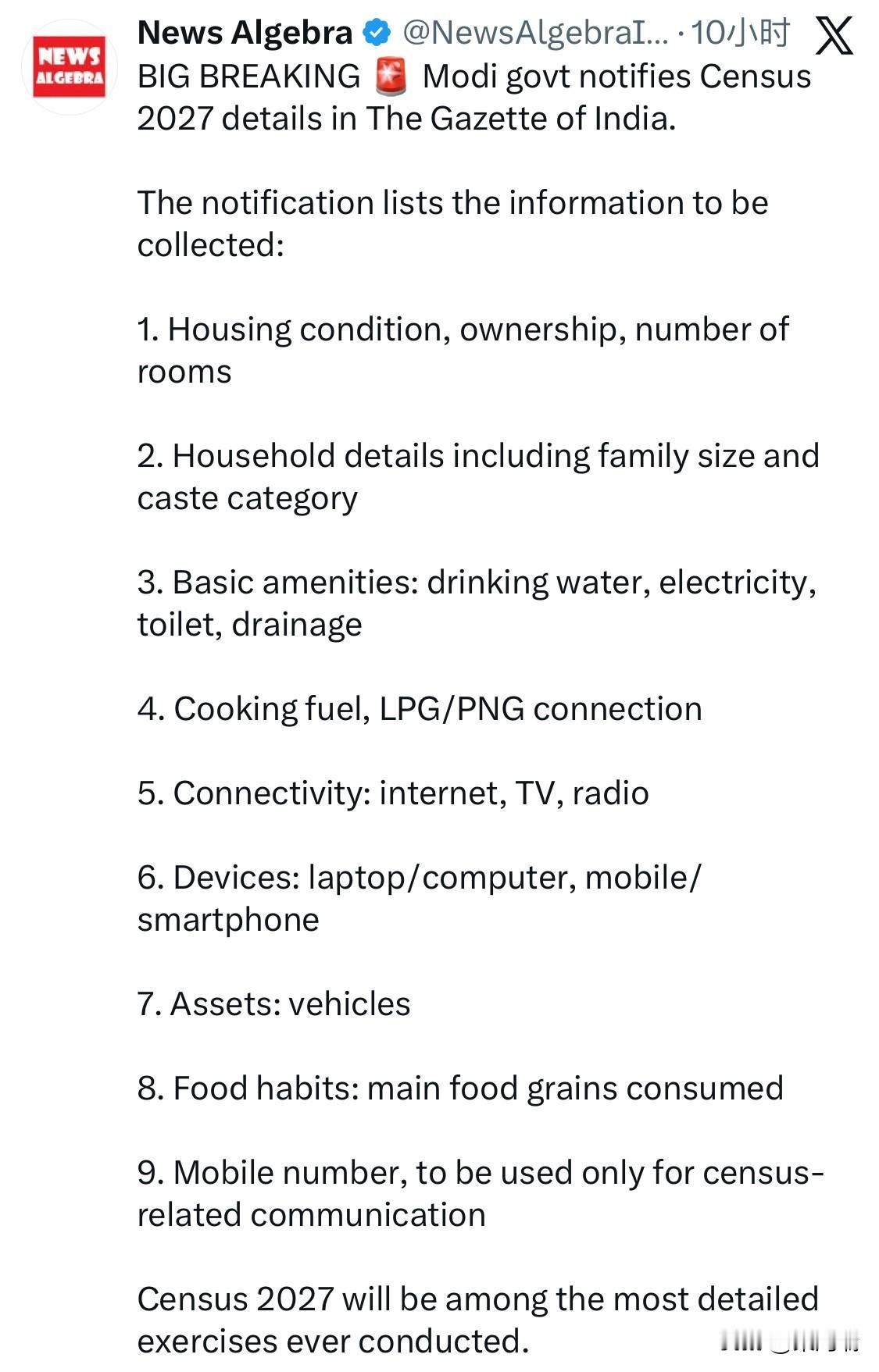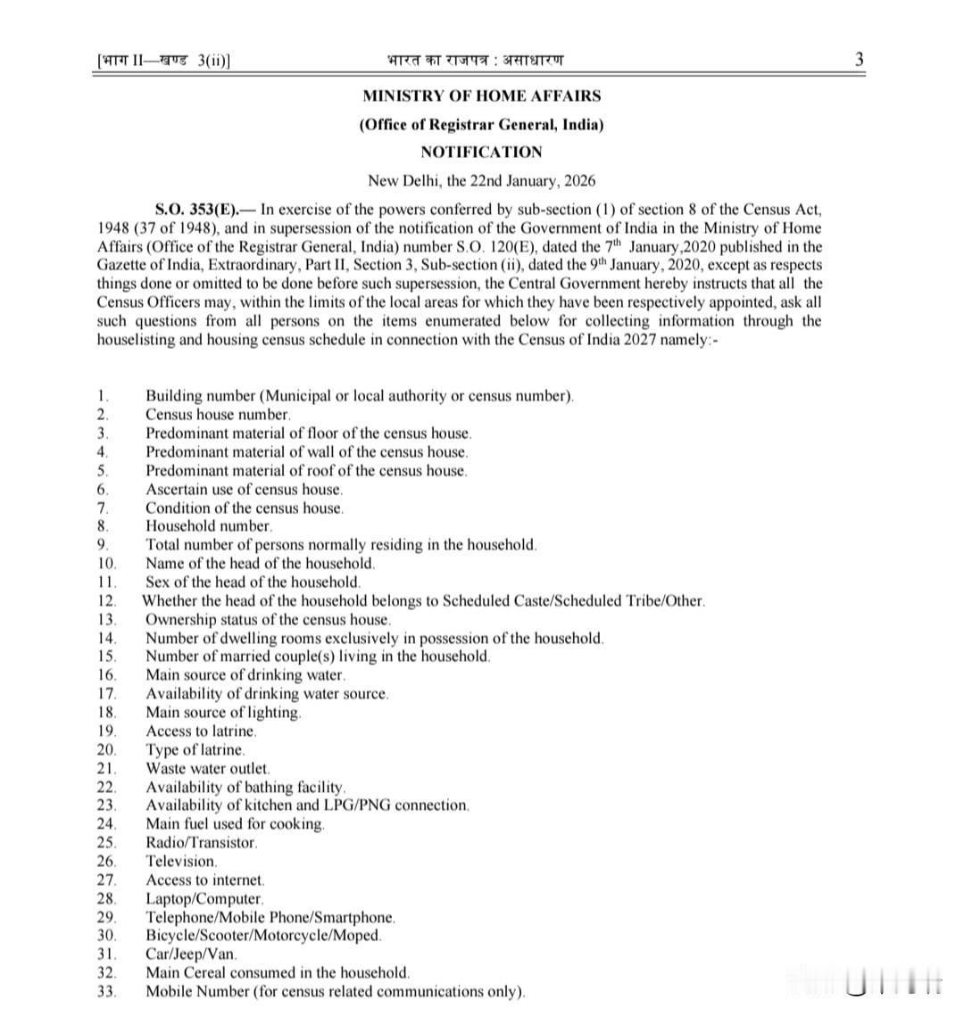 重大新闻:印度莫迪政府在《印度公报》上公布了 2027 年人口普查详情。 通知中列出了需要收集的信息: 1. 住房条件、所有权、房间数量 2. 家庭详情,包括家庭规模和种姓类别 3. 基本设施:饮用水、电力、厕所、排水 4. 烹饪燃料,液化石油气/管道天然气连接 5. 连接方式:互联网、电视、广播 6. 设备:笔记本电脑/台式电脑、手机/智能手机 7. 资产:车辆 8. 饮食习惯:主要食用的谷物 9. 手机号码,仅用于人口普查相关通信。 2027 年人口普查将是有史以来最详细的普查之一。