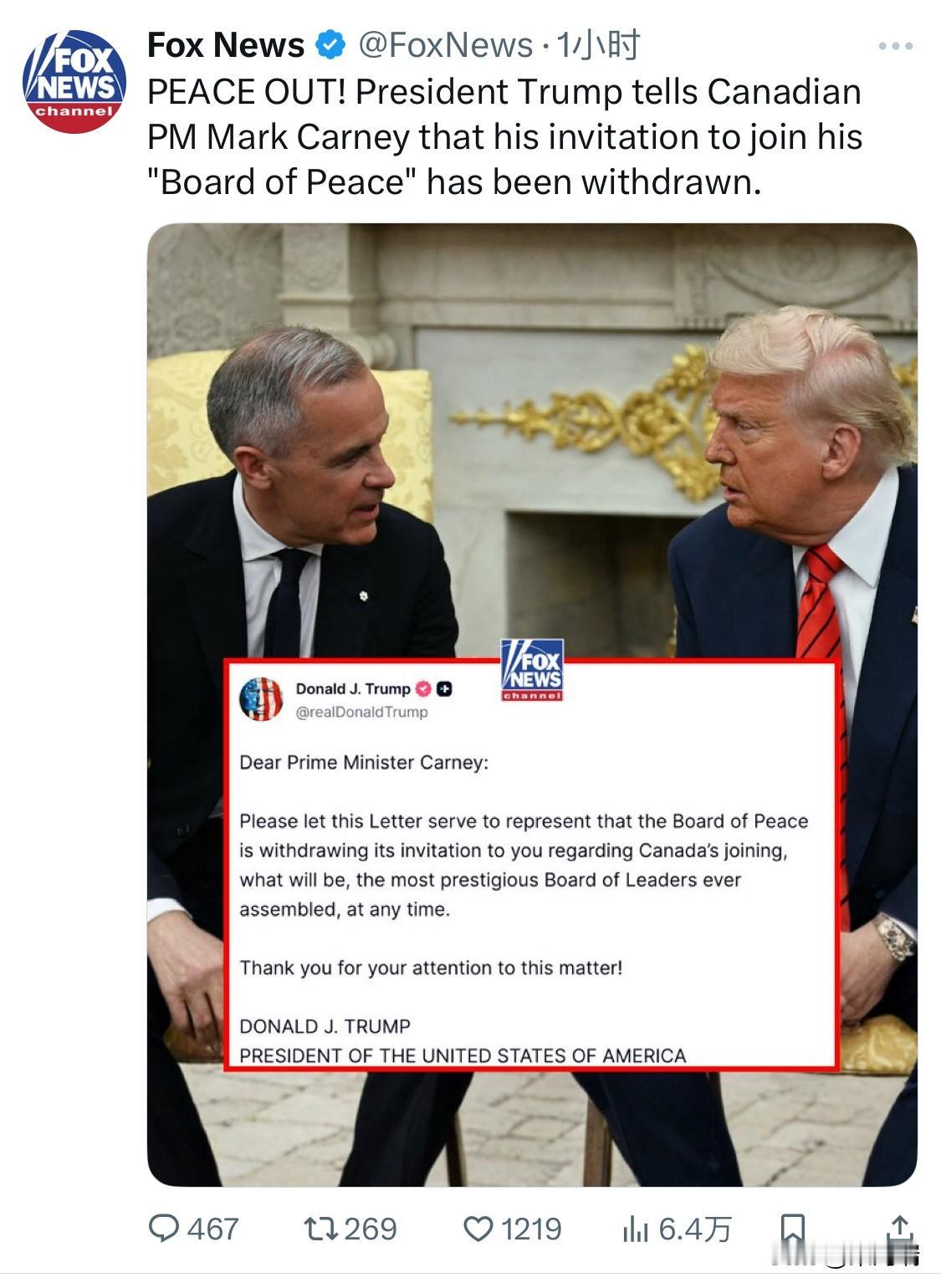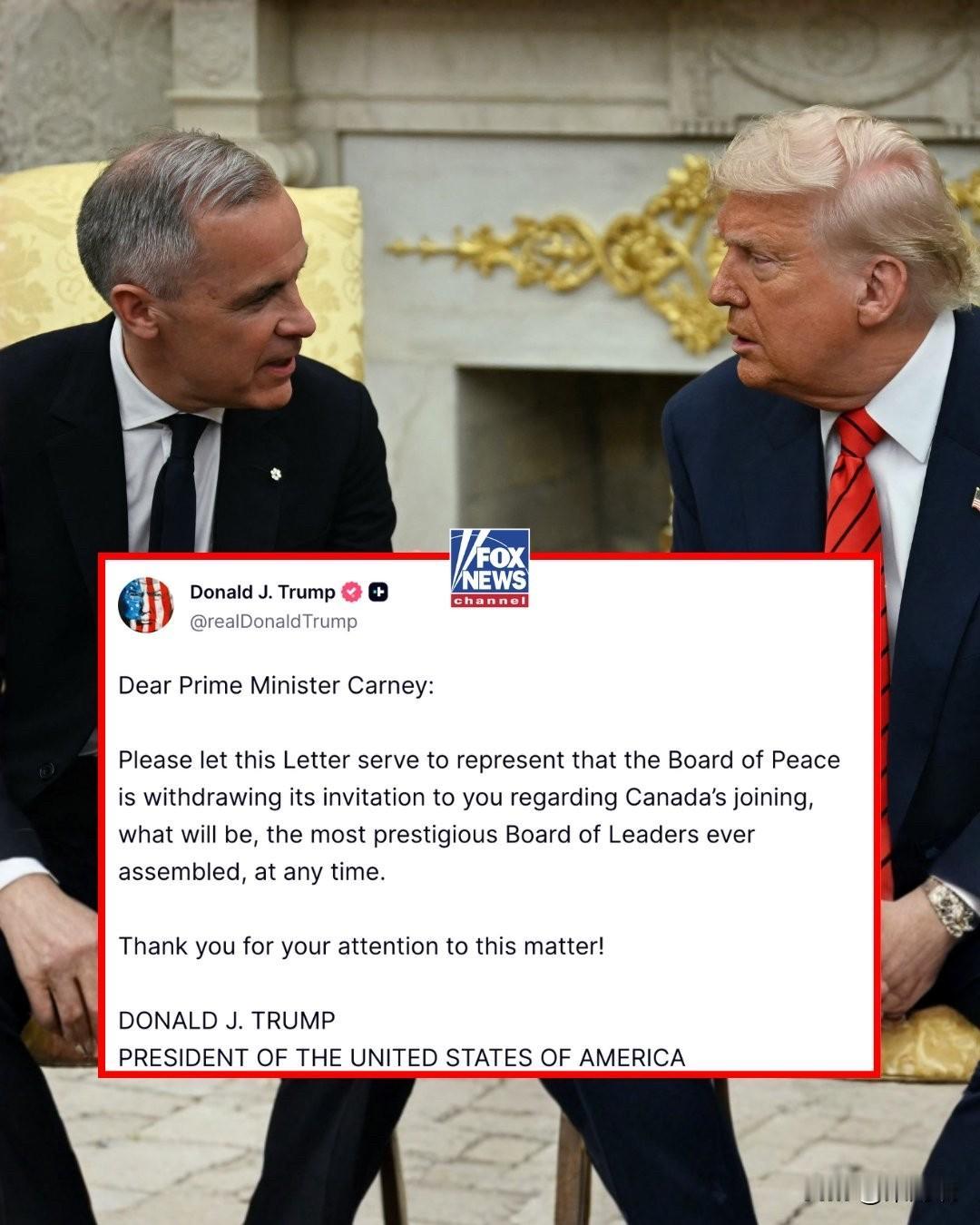 唐纳德·J·特朗普宣布“和平委员会”(Board of Peace)撤回对加拿大加入该组织的邀请,收件人是加拿大总理马克·卡尼(Mark Carney)。 特朗普总统在瑞士达沃斯举行的世界经济论坛上推出了这个新的国际组织,其既定目标是监督加沙地区的重建与过渡治理期。 加拿大总理马克·卡尼早些时候在论坛上发表了被认为是对特朗普政策进行批判的演讲,警告“中等强国”要团结起来对抗“霸权”力量的经济胁迫(如关税)。 作为回应,特朗普在自己的演讲中表示加拿大应该“感恩”美国的防卫贡献,并称“加拿大之所以存在,是因为有美国”。卡尼随后回击道:“加拿大之所以繁荣,是因为我们是加拿大人”。 在这些公开的口水战之后,特朗普于周四晚些时候通过社交媒体发布了这封信,正式撤销了对卡尼(代表加拿大)加入和平委员会的邀请。
