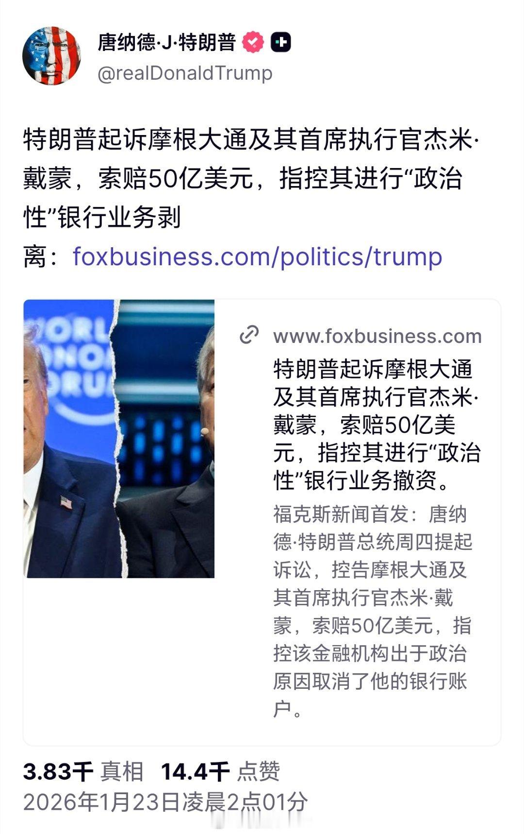 特朗普索赔50亿特朗普起诉摩根大通及其首席执行官杰米·戴蒙,索赔50亿美元。