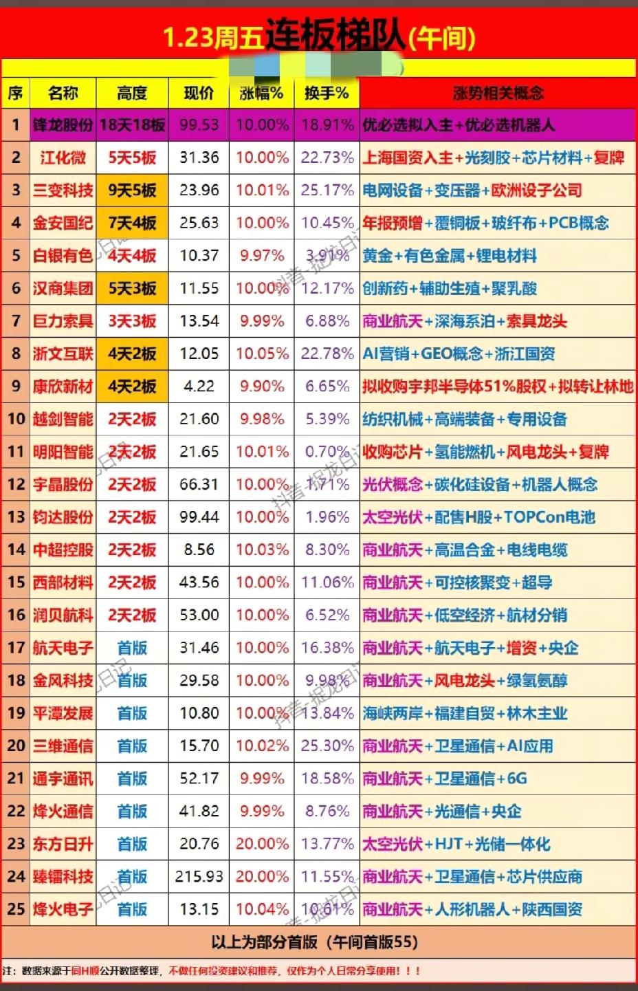 1月23日,周五A股午盘涨停一览表!!! 锋龙股份今日成功晋级18连板,优必选机器人概念股;江化微今日成功晋级5连板,光刻胶龙头概念股;三变科技9天5板,电网设备概念股;白银有色4天4板,金银继续狂飙!!!