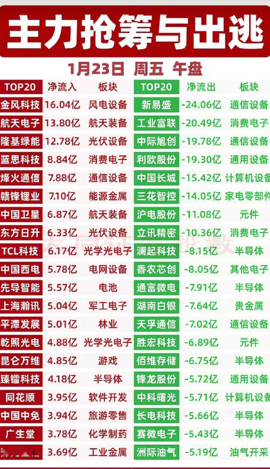 1月23日,周五午盘主力资金流入流出一览表!!! 金风科技主力资金净流入16.04亿;航天电子主力资金大幅流入13.8亿;蓝思科技主力资金大幅流入8.84亿;新易盛主力资金大幅流出24.06亿;工业富联主力资金大幅流出超20亿!!!