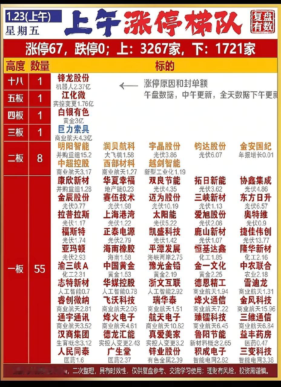 1月23日,周五午盘涨停一览表!!! 锋龙股份成功18连板,机器人概念股;江化微5连板;白银有色今日成功晋级4连板;巨力索具今日成功晋级3连板,商业航天概念股;明阳智能、润贝航科今日成功晋级2连板!!!