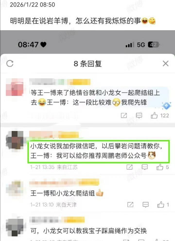 问:小龙女在绝情谷底呆了十六年,为什么不自己上去呢? 答:她是小龙女,不是王一博;她当年没遇上王一博 “等王一博来了绝情谷就和小龙女一起爬结组上去[笑哭]王一博:这一段比较难,我爬先锋” 笑疯了🤣不是,是谁这么有才啊?王一博就攀个岩!好家伙,网友从岩羊都已经联想到小龙女了? 王一博…… 哈哈哈哈哈,还有这“小龙女说我加你微信吧,以后攀岩问题请教你。王一博:我可以给你推荐周鹏老师公众号”,笑不活了,怎么还烁里烁气的呢? 不过王一博的确可以和小龙女请教踩扁带[捂脸]毕竟小龙女凌空卧绳那是轻轻松松[灵光一闪]。 不得不佩服,这届网友,太有才了,脑洞太大了[赞]! 抱走王一博,我们不看👀。 王一博