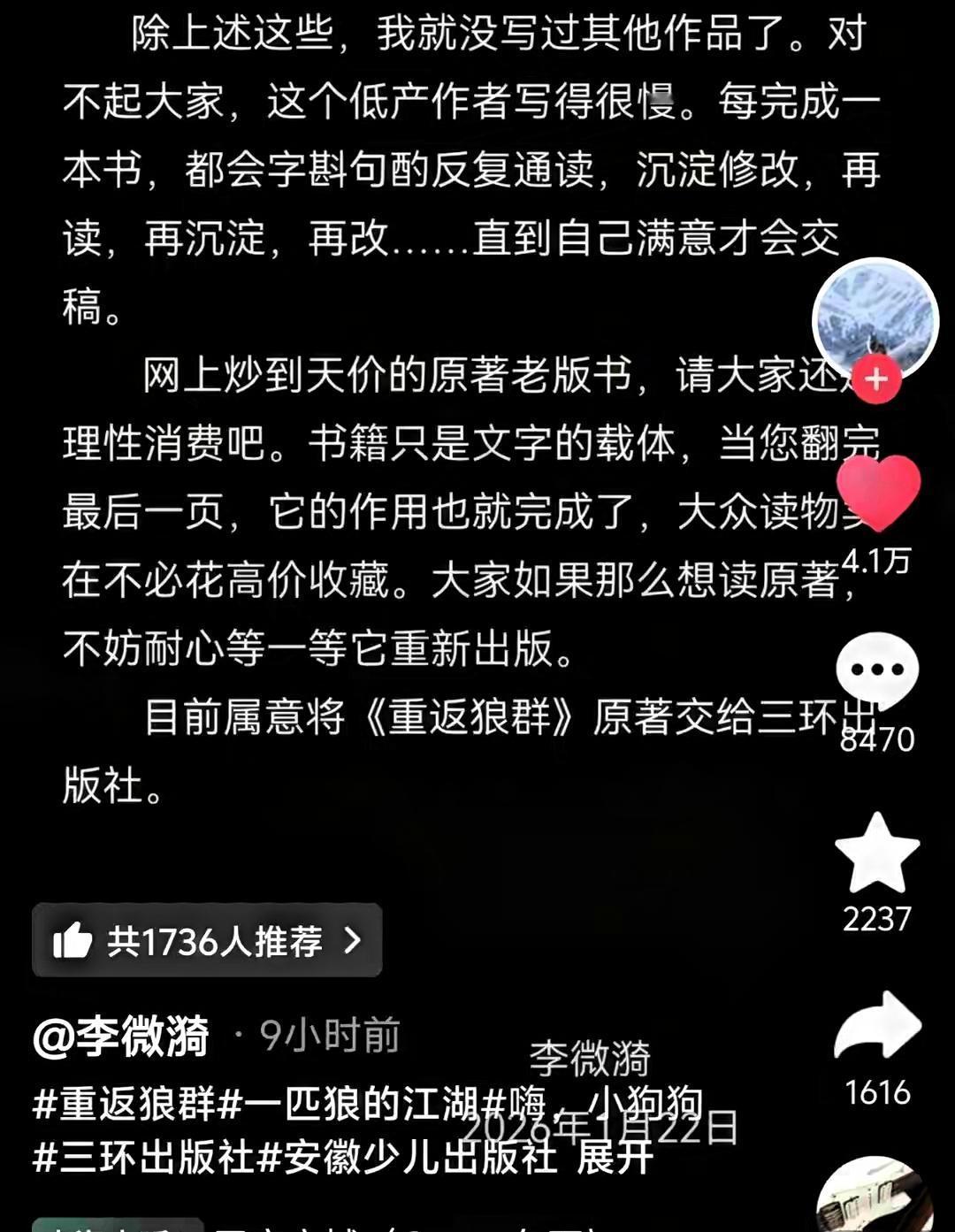 李微漪昨日更新,透露格林已离世,回复网友自己仍保留着红腰带 就在昨天,李微漪久违更新动态,没有声嘶力竭的告别,只是在评论区委婉回应了所有人最牵挂的事——格林,那个曾被她捧在手心养大的狼崽,终究遵循野生狼八九年的自然寿命,走向了生命的终点。有网友敏锐察觉,动态配乐是空灵的《天空之城》,瞬间猜到结局,李微漪默默点了赞,这个没有多余言语的小动作,瞬间看哭无数蹲守消息的网友。 谁能想到,一头狼能把人类的爱刻进骨子里?几年前《重返狼群》爆火,从不是因为什么猎奇的动物故事,而是我们在格林身上,看到了连人类世界都稀缺的纯粹与忠诚。它没有口袋,却把李微漪的红腰带视若珍宝,跟着狼群在草原上颠沛流离七年,那条红带子始终完好无损。我们总用“狼心狗肺”形容冷血无情,可偏偏是狼,一次次用行动打破了这句俗语的刻板印象。 更动人的是这份双向奔赴的爱。格林长大后,李微漪没有把它圈养在身边,而是狠下心送它回归荒野,那是放手的爱,是对生命最基本的尊重;格林在草原重逢人类妈妈,却只远远观望不敢靠近,那是克制的情,是刻在骨子里的野性与惦念。 面对网友高价收原版书籍、组团去草原寻找格林踪迹的举动,李微漪也温柔呼吁:别花冤枉钱,书只是文字的载体,等再版就好。是啊,真正的怀念,从不是跟风打卡,而是记住这份跨越物种的善意,尊重自然的法则。 野生狼的寿命本就只有八九年,格林的一生不算长,却把“爱与忠诚”四个字,演绎得淋漓尽致。它从不是谁的宠物,而是草原上自由的狼王,是无数人心里的白月光。那条红腰带还被好好珍藏着,格林的故事还在被人们提起,这份双向奔赴的爱,永远都不会褪色。