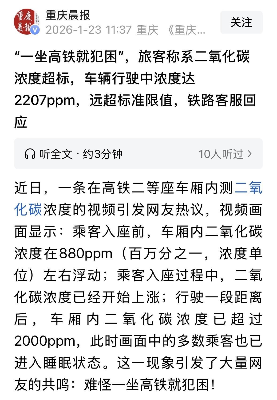 “真相了!”男子发现自己一坐高铁就特别容易犯困,提前喝咖啡都不管用,他觉得车厢空气一定有问题,就在一次坐高铁时,带着专业仪器检测了二等车厢里的二氧化碳浓度,他惊讶发现,行驶中浓度竟达到2207ppm,已经远超标准,对人体有影响,所以才会变得昏昏沉沉。对于这件事,12306客服的回应让人哭笑不得。 事情的起因是一男子发现,他一坐高铁就特别容易犯困,他上网一搜,发现一样情况的人还不在少数。 为了搞清楚到底咋回事,男子用实打实的数据,揭开了一个被很多人忽视的真相:高铁车厢里的空气,可能真的不太对劲。 这名男子名为余先生,是干空气检测这一行的,平时坐高铁就像坐公交地铁一样频繁。 因为工作性质,他经常得在车上办公,但有个怪现象一直困扰着他。 只要他一上高铁,哪怕刚喝了提神醒脑的咖啡,没过一会儿眼皮还是会开始打架,脑子昏昏沉沉,控制不住地想睡觉。 余先生一开始也怀疑是不是自己身体太虚了?但职业敏感告诉他,这事儿没那么简单。 前两天出差,他特意带上了专业的检测仪器,决定一探究竟。 这一测,还真测出了问题。 他发现,刚上车没人的时候,车厢里的二氧化碳浓度大概在880ppm,百万分之一左右,这还算正常。 可一旦乘客开始入座,这数字就像坐了火箭一样往上窜。 等车开出去一段路,大家都安顿下来开始补觉的时候,仪器上的数字直接飙到了2000ppm以上。 2000ppm是个什么概念?《室内空气质量标准》里规定,室内二氧化碳浓度不能超过1000ppm。 这高铁里的空气,直接超标了一倍。 余先生后来查了资料,发现这二氧化碳还真是个隐形催眠师。 当空气里的二氧化碳浓度超过1000ppm,人的脑子就开始转得慢了,决策能力直线下降。 要是到了1400ppm,认知功能那是大幅跳水。 这也就解释了为什么很多人一坐高铁就哈欠连天。不是你想睡,是大脑被高浓度的二氧化碳给抑制住了,被迫关机了! 这事儿爆出来后,大家都觉得很后怕。 现在的生活离不开高铁出行,可竟然是在这种高碳环境里熬着,这符合规定吗? 后来,一个记者直接把电话打到了铁路12306客服那里。 第一个客服接电话时,给出的建议让人哭笑不得,说如果您觉得不舒服,可以自行吸氧。 好家伙,坐个高铁还得自备氧气瓶?这是把乘客当登山队员了? 第二个客服表示,这个标准我们暂不掌握,目前没有这个标准。 这就有点睁眼说瞎话了,标准明明摆在那儿,怎么就暂不掌握了? 还有客服解释说:高铁虽然是密闭空间,但中央空调一直在恒温换气,肯定有氧气,不会缺氧。 至于为什么测出来二氧化碳高?客服的解释是:可能是因为乘客密度变高了,人多吐出来的气自然就多。 这话听着好像有点道理,人多确实废气多。但问题是,标准规定的是室内空气质量,不管你人多人少,作为提供服务的铁路方,你的通风系统是不是得保证空气质量达标? 如果一趟车人坐满了,二氧化碳就必然超标,那是不是说明这车的通风设计本身就有问题,或者新风系统根本没开足马力? 更讽刺的是,《铁路旅客运输服务质量规范》里明明写着第7.3.1条:列车要保证通风系统作用良好,车内空气清新,质量符合标准。 现在乘客实测数据都爆表了,这“作用良好”体现在哪儿呢? 余先生的理论火了之后,很多网友都在评论区倒苦水,说怪不得每次坐完高铁头疼欲裂,原来是吸了一路的废气。 以前以为是自己累了,现在才知道是被熏晕的。 其实仔细想想,这事儿挺让人无奈的。一方面,高铁确实方便,咱们的基建也是世界一流。 但另一方面,这种密闭空间里的空气质量,长期以来似乎成了一个灰色地带。 客服那句自行吸氧虽然是句玩笑话般的建议,但也透着一种尴尬的现实:在现有的硬件条件下,如果通风就是跟不上,除了让乘客自己忍着或者自己想办法,似乎也没别的招。 但这不应该是终点。既然有了国标,既然有了服务规范,铁路部门就得拿出个说法来。 是改进通风系统?还是在满员时加大新风换气量?总不能让乘客花了钱,还得在这个高二氧化碳浓度的罐子里,稀里糊涂地把觉睡了,把身体伤了。 有人说,希望铁路设计部门要考虑周全,不要等旅客提出了问题才想法解决,那样会给铁路公司带来重大经济损失。但已经发现了问题,就要及时改正,不能因为需要花钱就一拖再拖。 对此,你怎么看? 关注@运良说法 学法律知识不迷路