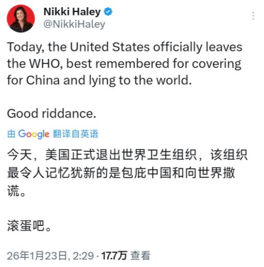 美国前驻联合国大使妮基·黑利今天(北京时间1月23日)写道:“今天,美国正式退出世界卫生组织,该组织最令人记忆犹新的是包庇中国和向世界撒谎。滚蛋吧。” 这纯属睁着眼睛说瞎话,既无知又满是恶意,说到底就是为美国退出世卫组织找借口,把自己的烂摊子甩给别人,还顺带抹黑中国,荒谬到了极点。 先说说这个退出时间的事,黑利连最基本的事实都没搞清楚,就敢出来乱喷,可见有多不负责。根据世卫组织的规定,成员国要退出,得提前一年提交通知,还得结清所有拖欠的会费,才算正式退出。 美国前总统特朗普是在2025年1月20日签署行政令,宣布要退出世卫组织,联合国在1月22日收到了通知,按照规则,美国正式退出的日期应该是2026年1月22日。 黑利23日才发文说“今天正式退出”,连时间都对不上,这不是无知是什么?说白了就是为了喷而喷,根本不管事实真相。 再说说她嘴中“世卫组织包庇中国、撒谎”的鬼话,这更是毫无根据的抹黑。疫情发生后,中国一直积极配合世卫组织工作,主动公开疫情信息,还邀请世卫组织联合专家考察组来中国实地调研。 考察组在结束9天的考察后,明确表示中国采取了前所未有的公共卫生应对措施,有效减缓了疫情扩散,避免了数十万病例的发生,还呼吁各国学习中国的防控经验。世卫组织总干事谭德赛也多次称赞中国的防控举措,说中国为全球抗疫赢得了宝贵时间。 中国从头到尾都在公开透明地应对疫情,及时分享病毒基因序列、防控方案,还向多个国家和地区提供疫苗援助,为全球抗疫作出的贡献有目共睹。 联合国秘书长古特雷斯都公开感谢中国,说中国人民为遏制疫情蔓延付出巨大牺牲,正在为全人类作贡献。这么多真实发生的事,黑利视而不见,反而编造“包庇”“撒谎”的谎言,不是恶意抹黑是什么? 其实美国要退出世卫组织,根本不是因为什么“世卫组织包庇中国”,而是想为自己抗疫不力甩锅。 大家都知道,美国作为全球最大的经济体,医疗资源雄厚,可在疫情中的表现却一塌糊涂。截至2025年5月,美国新冠累计确诊病例超3300万,累计死亡病例超59万,位居全球首位,而实际死亡人数可能远超官方统计,有机构估算超过90万。 美国抗疫之所以搞得这么糟,根源就在其国内的政治操弄。前总统特朗普屡次发布虚假信息,说新冠是“大号流感”,死亡率“非常低”,还说疫情会“奇迹般消失”,误导民众。 政府还蔑视专业知识,为了短期经济利益忽视防疫建议,把戴不戴口罩都变成了政治符号。各州各自为战,争抢防疫物资,互相指责,完全没有统一的防控战略。 面对这么烂的抗疫成果,美国不想着反思自己,反而想通过退出世卫组织、抹黑中国和世卫组织,转移国内民众的不满,这才是真相。 更可笑的是,美国连退出世卫组织的基本要求都没做到。世卫组织已经明确表示,美国还拖欠着2024-2025双年度的2.78亿美元会费,却明确说“退出前不会支付任何款项”。 自己欠着钱不还,还倒打一耙说世卫组织有问题,天下哪有这样的道理?当初特朗普政府就想退出世卫组织,后来拜登政府上台又撤销了决定,现在又要退出,反复无常的背后,都是美国的政治算计,根本不管全球民众的健康福祉。 黑利作为前驻联合国大使,不可能不知道这些基本事实,可她还是故意编造谎言、抹黑中国。明眼人都清楚,她这么做就是为了自己的政治利益。 这些年,黑利频繁拿中国说事,一会喊着要和印度联手对抗中国,一会把中国称为“敌人”,无非就是想靠炒作反华话题博眼球、拉选票。在她眼里,什么事实真相、全球抗疫大局都不重要,只要能给自己捞取政治资本,怎么抹黑怎么来。 国际社会对美国的这种做法也早有批评。美国国会参议院外交关系委员会成员罗伯特·梅嫩德斯就说,退出世卫组织不会保护美国人民,只会让美国人更危险,让美国孤立无援。 联合国基金会主席也表示,世卫组织是唯一能领导全球抗疫的机构,美国退出会破坏全球抗疫合力,让所有人都处于危险之中。俄罗斯智库也指出,美国控诉世卫组织,就是为自己抗疫不力找“替罪羊”,把疫情当成政治工具。 疫情是全人类共同的敌人,需要各国团结协作,靠世卫组织协调应对。美国动辄“退群”“甩锅”,黑利故意编造谎言抹黑中国和世卫组织,不仅解决不了自己国内的问题,还会破坏全球抗疫大局,损害各国人民的利益。 这种无知又恶意的言论,根本骗不了人,反而只会暴露美国的自私和霸道,让世界看清美国为了政治利益不择手段的真面目。 黑利想靠甩锅中国博关注,注定是徒劳的。事实就摆在那里,美国抗疫不力是自己的问题,拖欠会费、退出世卫组织是不负责任的表现,再怎么抹黑别人也掩盖不了自己的烂摊子。
