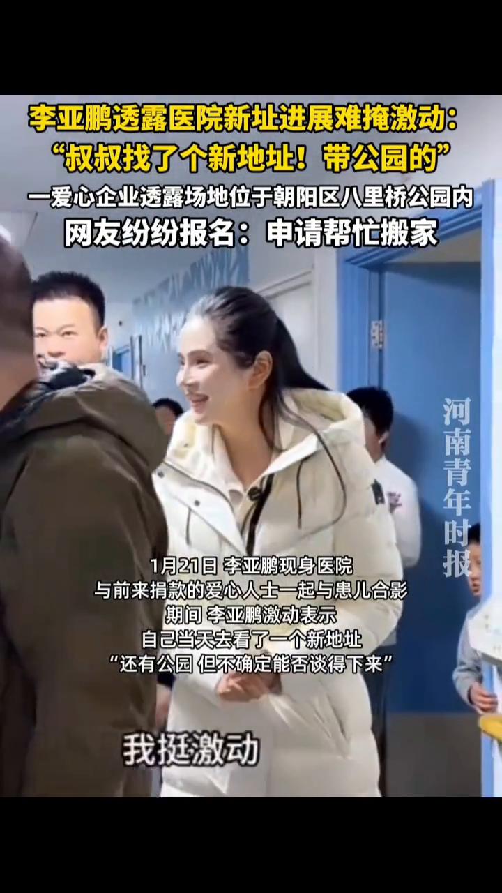 李亚鹏透露医院新址进展难掩激动:"叔叔找了个新地址!带公园的"。 河南青年时报。 1月22日(报道)北京,1月21日李亚鹏现身医院,与前来捐款的爱心人士一起与患儿合影。期间李亚鹏激动表示,自己当天去看了一个新地址,"还有公园但不确定能否谈得下来"。 有爱心企业负责人在社交媒体透露,企业愿提供的场地就位于朝阳区八里桥公园内,且曾作为医院运营有相关设备设施。 1月21日北京嫣然天使儿童医院最新声明中也提到,"根据大家提供的信息,医院正在积极推进新址寻找工作,同时也和房东积极推进沟通。"