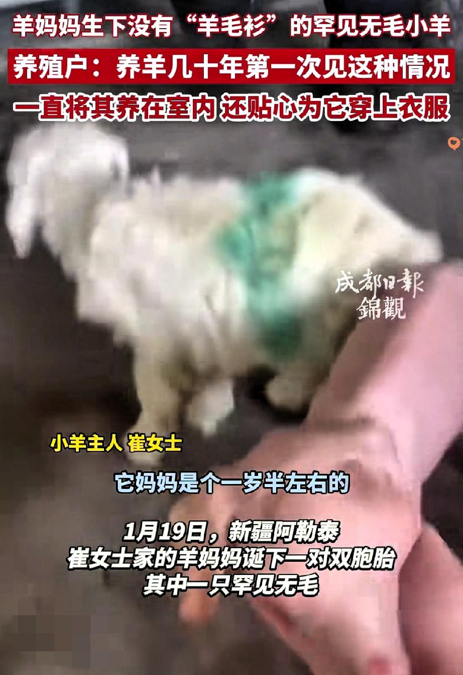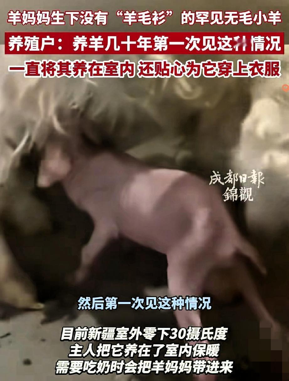 谁能想到新疆的一只母羊生双胞胎,居然生出个“反差萌”,一只毛茸茸超可爱,一只光溜溜没一根毛! 养了十几年羊的主人都直呼头回见,生怕小家伙冻着,赶紧给它穿上小衣服,这波操作真的暖到心坎里。 都说双胞胎该是一模一样,这只无毛小羊的出现满是意外,好在它身体倍儿棒,活泼又健康。 在天寒地冻的新疆,一件小衣服不仅是保暖的防护,更是主人藏在细节里的温柔。 万物皆有灵,哪怕是养在圈里的小羊,被用心对待的模样,总能戳中人心最软的地方。 其实养动物的乐趣,就在于这些猝不及防的小意外和心甘情愿的偏爱,你用心护它周全,它用鲜活的生命力陪你日常,这就是最治愈的双向奔赴。 你见过哪些动物界的可爱小意外?评论区分享下吧!