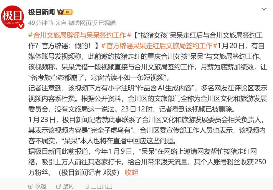 据极目新闻最新消息,合川文旅及合川区委宣传部出来辟谣了,呆呆并没有签约合川文旅,并表示,呆呆本人也将在直播中回应这些问题。 合川呆呆自杀猪宴火了之后,粉丝超过250万,可以说成为合川刨猪汤的“名片”,台湾朋友到合川后,呆呆还作为陪同一路陪吃陪玩体验重庆美食美景。 有网友看到呆呆经常坐文旅的车,于是就有网友说呆呆签约了合川文旅,成为了合同工,甚至还像模像样的说工资是底薪加绩效之类的。 1月23日,合川文旅负责人出来回应,称网传视频中“呆呆获合川文旅局签约”纯属“完全子虚乌有”。另外合川宣传部工作人员也出来辟谣,称视频中的内容是不属实的。 同时,宣传部工作人员还透露,呆呆将会在直播中回应这些问题。 查看呆呆的社媒,发现呆呆已经发布了直播预告,1月24日晚上8点将有一场直播,可能呆呆将在直播中回应大家关心的问题。 值得一提的是,呆呆杀猪宴已经过去接近半个月,大家就不要再去过多的打扰她的父母了,呆呆的美甲店关了,呆呆也多次喊话粉丝不要过多打扰她父母,让她父母能回归宁静的生活。 但还是会出现令人恶心的“一幕”,大家为了流量真的是费尽心机的。1月22日,有网友发现呆呆家里来了一辆豪车,大家以为是呆呆回家了。 而令人想不到的是,这辆豪车下来是三个美女,拿起乐器竟然在呆呆家门口开启了直播,这么大动静让呆呆父母如何接受得了。 呆呆父母出来劝了一次,对方不听,后来只能叫来工作人员上前劝导。 有流量就有收益毋庸置疑,但大家为了流量也不能没底线,大家喜欢呆呆就应该爱护呆呆及呆呆家人。 对此,您怎么看?