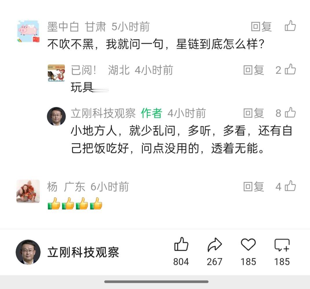 项立刚先生怒火满腔。 1月23日,项立刚在早上写了一篇文章,他说弄不好以后在6G这块,我们就是主导者了。 有些网友看了他的文章后,也给他留言了。令人意想不到的是,有些网友没有得到称赞之语,反而还要承受项立刚的雷霆之火。 网友“哈哈”谈到了马斯克的星链计划,项立刚的心中升起了怒火,怒斥了这位网友(见图一)。 网友“墨中白”说,不吹不黑,星链到底是怎么样的? 项立刚一见此言,怒火又来了,重重地怒批了这位网友(见图二)。 还是要提一句老话:在网络交流中,我认为排在首位的是文明交流,同时也要善于倾听对方的意见。眼看就要过大年了,亲戚朋友难免要相聚,交谈时就更该和和气气。“文明交流”这四个字,无论在现实生活里还是网络空间中,都能发挥重要作用,也都有着重要意义。