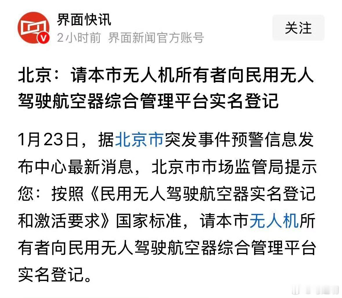 北京:请本市无人机所有者向民用驾驶航空器综合管理平台实名登记。