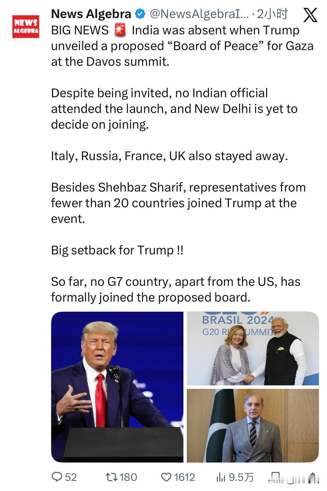 重大新闻:特朗普在达沃斯峰会上公布了为加沙设立“和平委员会”的提议时,印度缺席。 尽管受到了邀请,但没有一位印度官员出席启动仪式,新德里方面尚未决定是否参加。 意大利、俄罗斯、法国、英国也未到场。 除了谢赫巴兹·谢里夫之外,还有不到 20 个国家的代表与特朗普一同出席了此次活动。 特朗普遭遇重大挫折!! 到目前为止,除美国外,没有一个七国集团国家正式加入拟议的董事会。