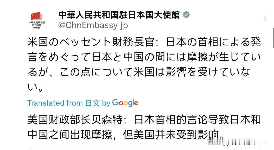 日本国内破防了!1月23日,中国驻日大使馆转发了美国财长贝森特的话。中国驻日大使