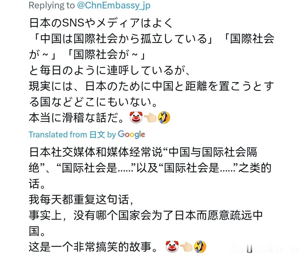 日本国内破防了!1月23日,中国驻日大使馆转发了美国财长贝森特的话。中国驻日大使馆刊文称,美财长贝森特表示:日本和中国,因为日本首相的一些言论而发生了摩擦,不过,美国在这方面并未受到影响。很显然,日本网友看见这样的刊文之后,显得非常的破防。 有日本网友表示,日本的社交网络和媒体经常声称,中国被国际社会孤立了”,“国际社会……”,虽然每天都在喊,但现实中,没有哪个国家愿意为了日本而与中国保持距离。真是滑稽的故事。有网友则非常直接的表示,美国财长的意思无疑是告诉日本,日本有事就是日本有事,不关我美国的事。 很显然,从贝森特的表态,我们看的非常清楚,尽管我们用管制反制打击日本,但面对正在承受压力的日本,贝森特是一句话都不愿意帮日本说。美国的这种事不关己,高高挂起的态度,无疑让日本国内感受到了刺骨的寒意。高市早苗前几天还声称要联合志同道合的盟友对中国施压,贝森特的冷漠表态,这无疑打了日本一记耳光。一句话,日本惹的事,日本自己扛,哪有什么盟友会为日本出面?