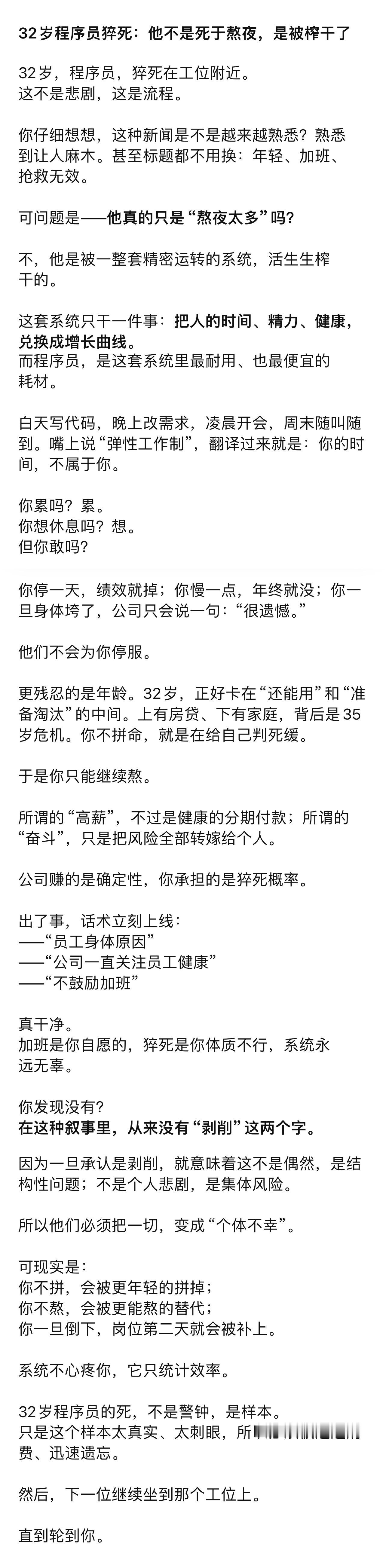 32岁程序员之死所有人都说猝死程序员明年能升总监猝死程序员累得早上闹钟叫不醒猝死程序员公司双休也是带工作回家