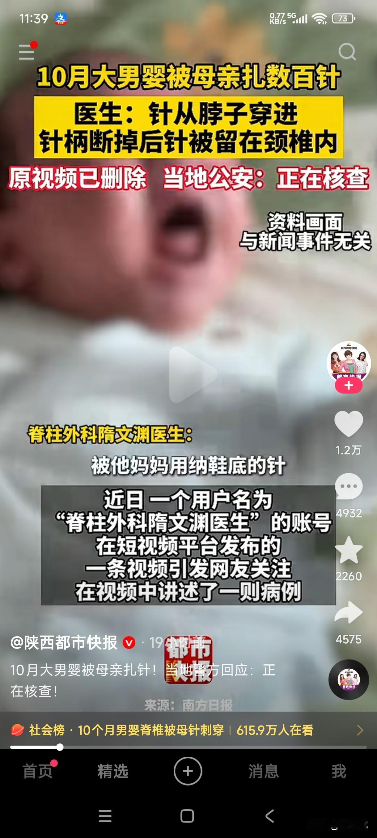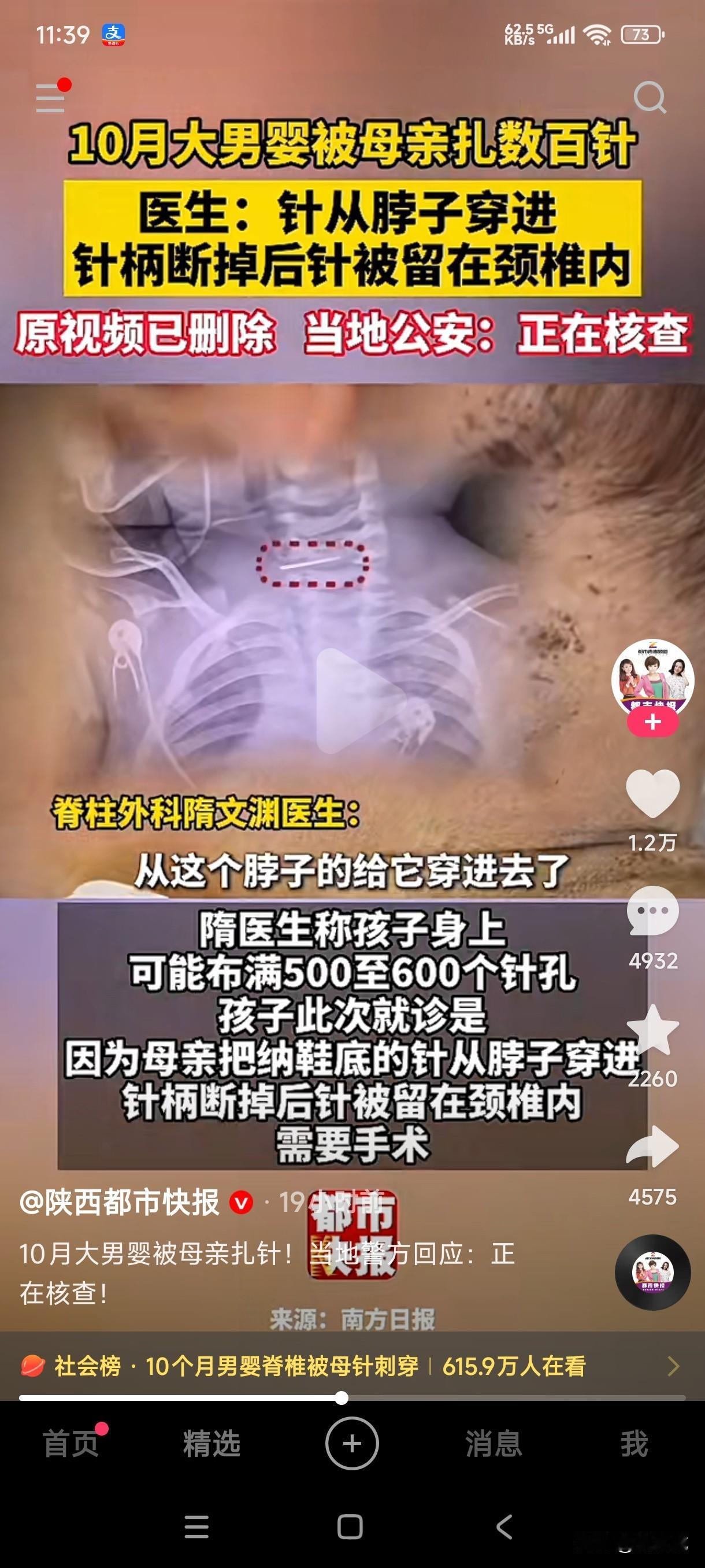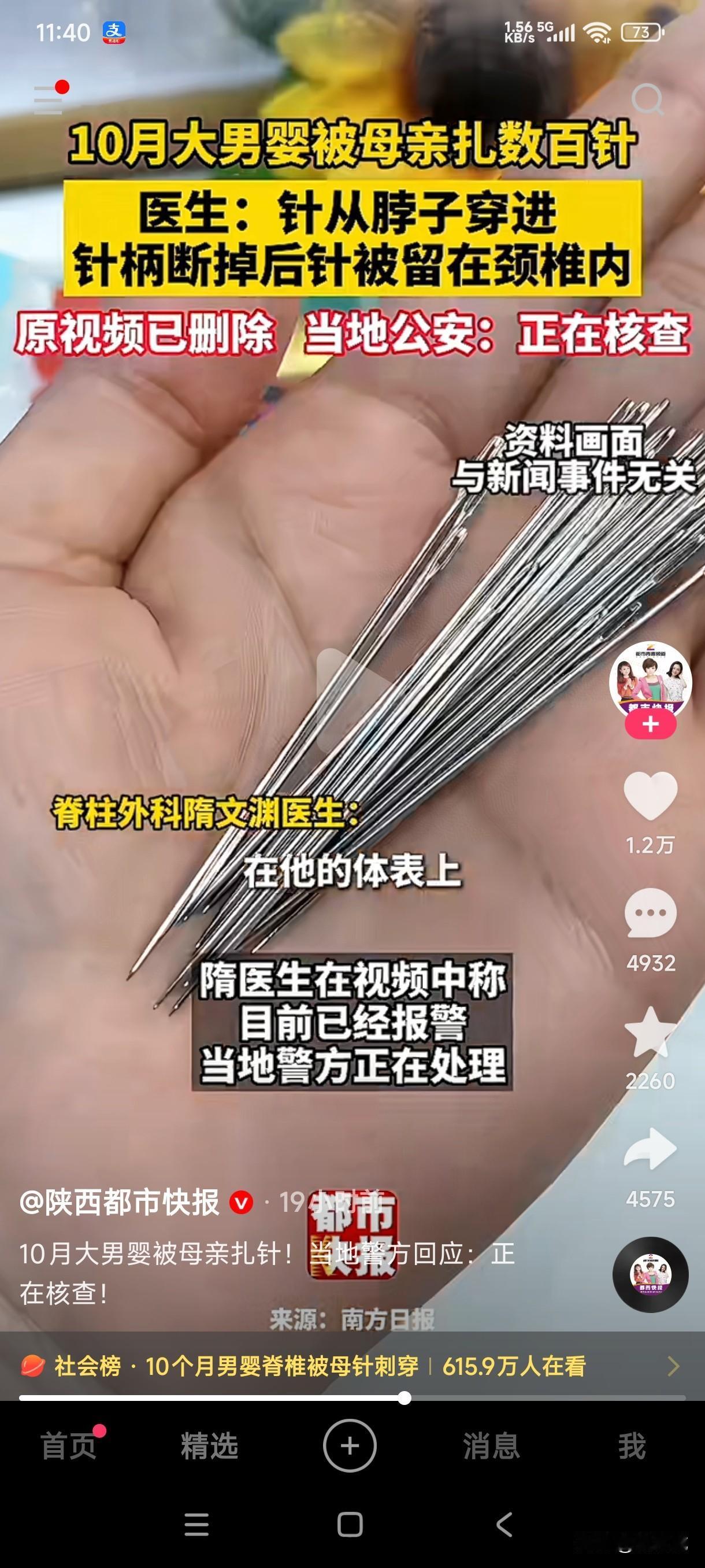 10个月大男婴被母亲用纳鞋底的针从脖子穿进,针柄断掉后针被留在颈椎内,身上布满500到600个针孔。 老话说虎毒不食子,这母亲是不是蛇蝎心肠之人,不知她为什么要对10个月大的孩子下这么狠的手,那可是自己身上掉下来的肉啊,要不是针断掉后留在颈椎内需要做手术,这惨痛一幕若不是被医生发现,这孩子是不是就死在自己母亲的手里,虽说母爱是伟大的,但不是所有的女人都配做母亲,这母亲的做法真是让人后背发凉,这做法比有些后妈还歹毒,如此心狠手辣的女人绝不能让她以后在看孩子,必须对她严惩不贷,这哪里是虐待孩子,这不是变相致孩子于死地吗?